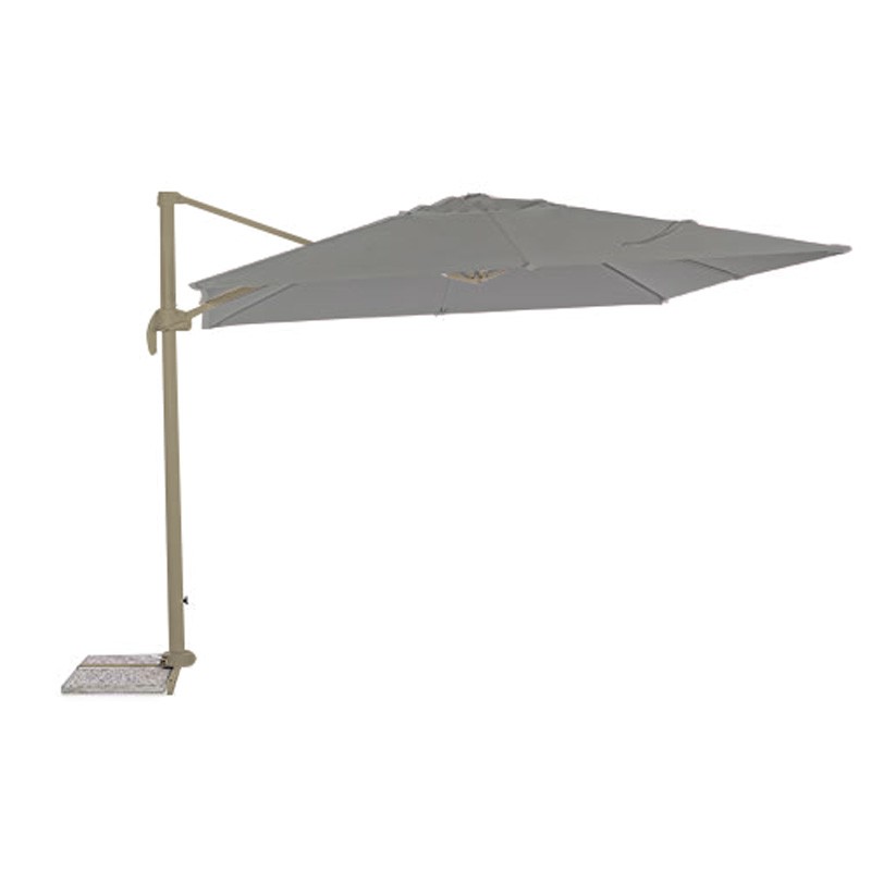 Elegante Ombrellone Decentrato e solida struttura in alluminio verniciata a polvere, impugnatura per proiettarlo in 5 posizioni e la pedalina per ruotarlo a 360° in modo da scegliere la posizione in base alle proprie necessità. Telo color grigio in poliestere e acrilico 250 g/m2. Base laterale completamente in acciaio resistente agli agenti atmosferici. Ideale per tenersi al riparo dal caldo estivo creando piacevoli zone d'ombra. Un ombrellone da giardino è la soluzione ideale per completare l'arredo outdoor. Inoltre, grazie alla struttura con palo laterale è perfetto per ottimizzare ogni tipo di spazio.