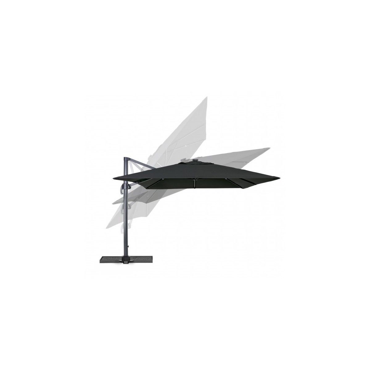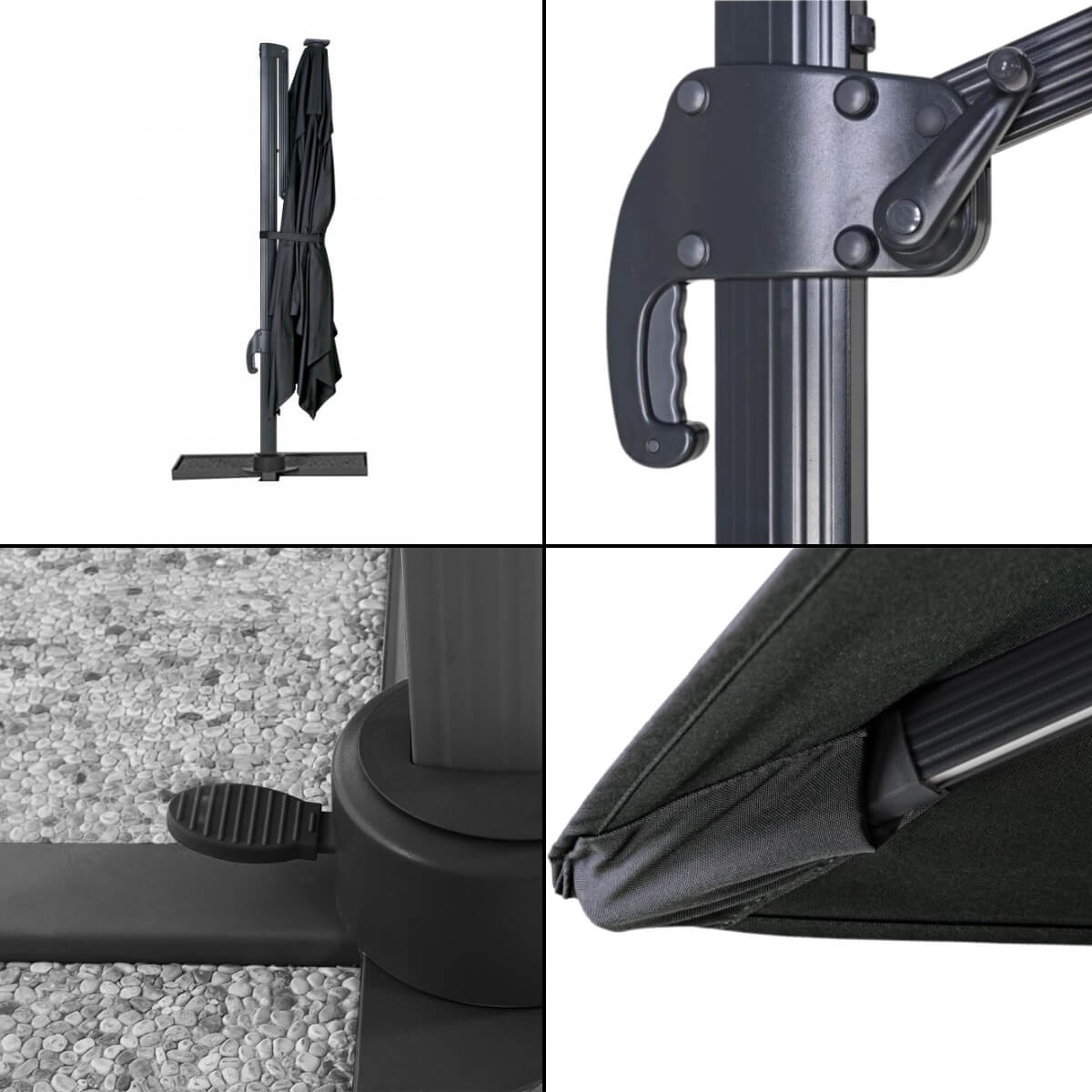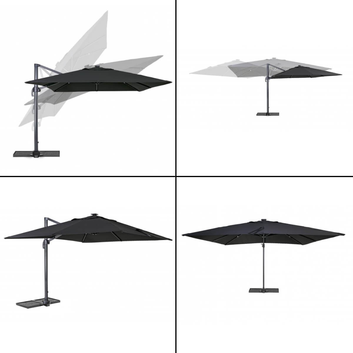 Con la regolazione dell'inclinazione in 5 posizioni e la rotazione a 360° con pedale a frizione, potrai facilmente adattare l'ombrellone con palo decentrato alle tue esigenze e godere di una copertura completa. Il telo nero in poliestere e acrilico con camino antivento, ti garantirà una protezione ottimale dai raggi UV.