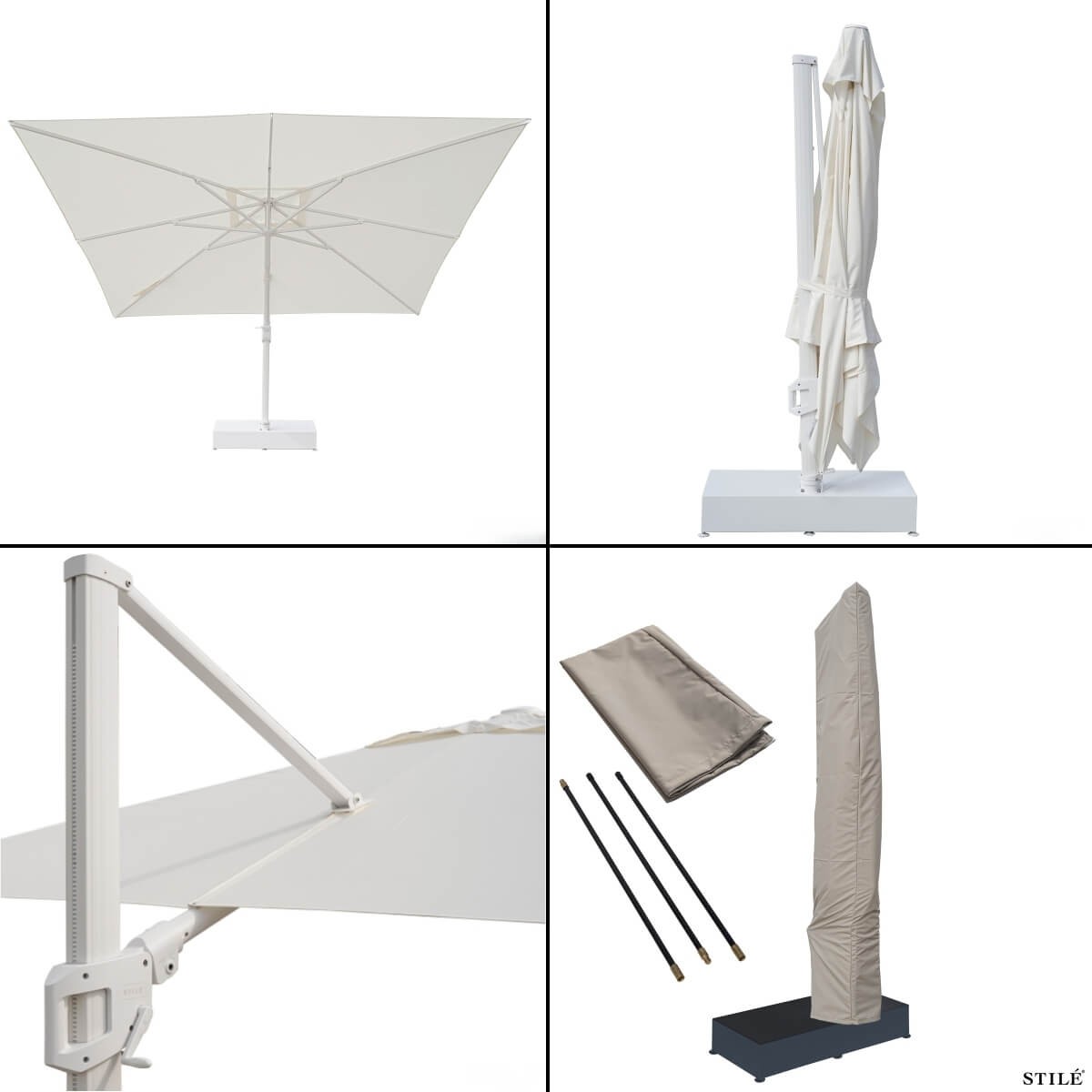 Disponibile nei colori bianco e grigio, è la soluzione ideale per chi cerca un ombrellone da giardino moderno, resistente e altamente funzionale.