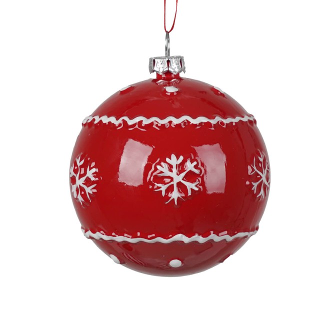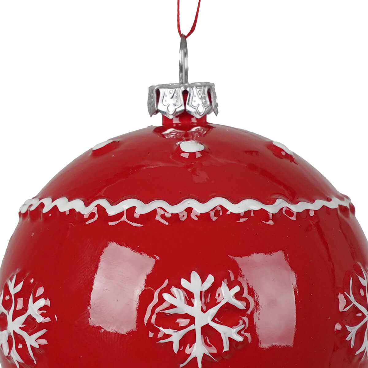 - Palla natalizia rossa decorata con fiocchi di neve bianchi in rilievo, dallo stile classico e raffinato.