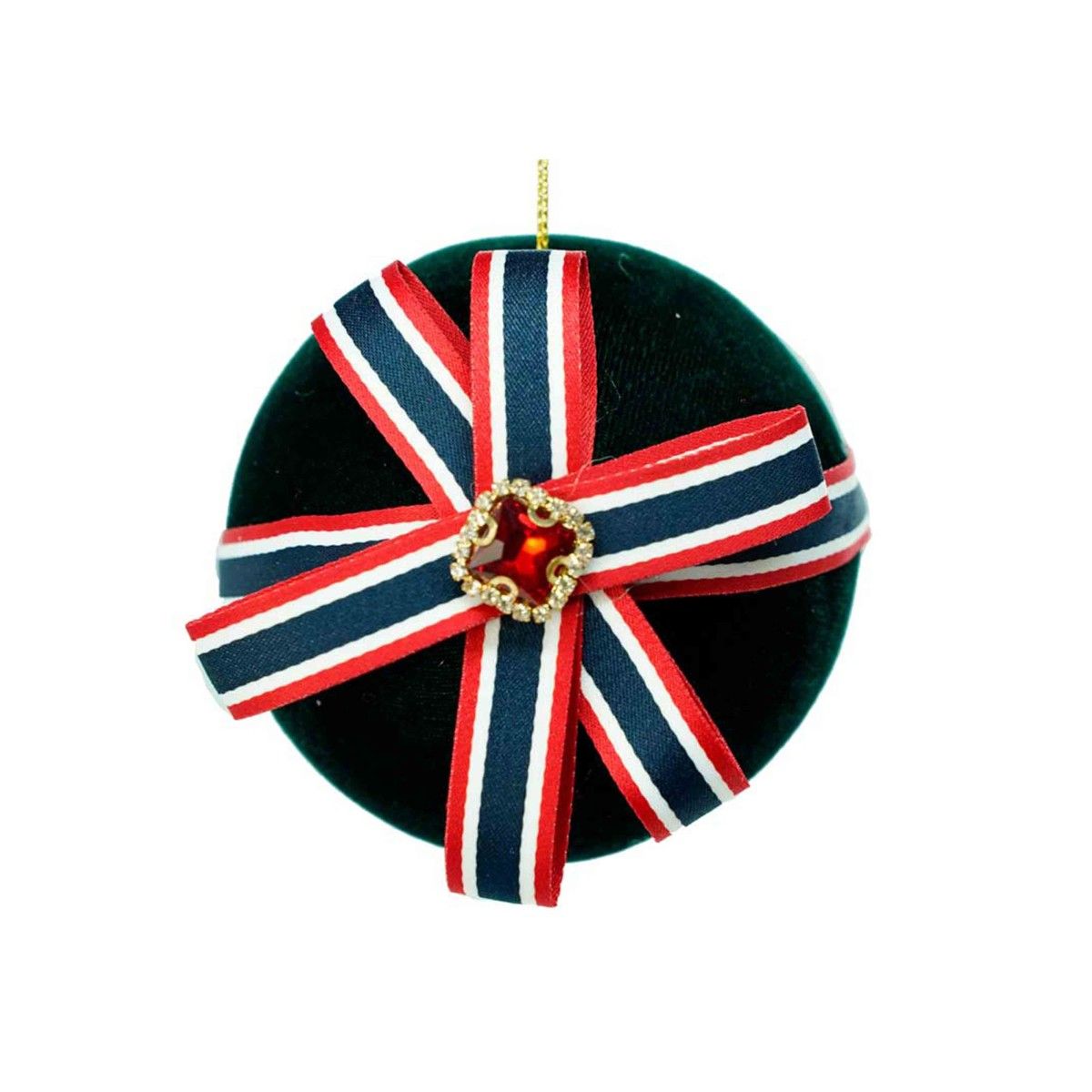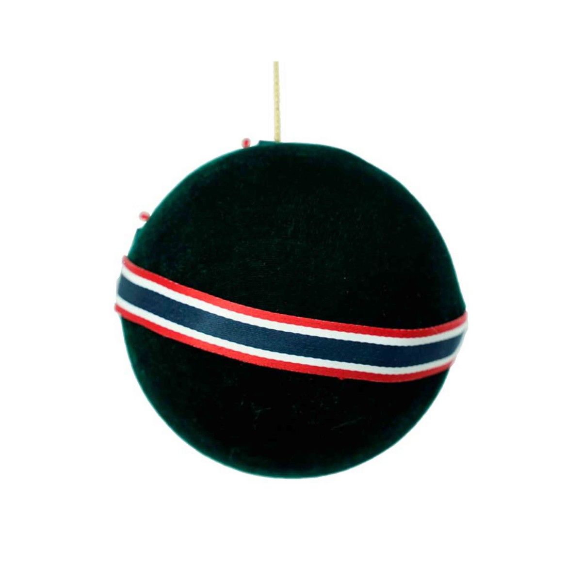 - Palla di Natale in velluto verde con nastro rosso e blu