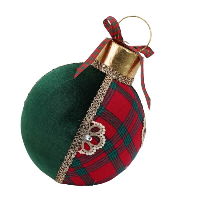Aggiungi un tocco di eleganza vintage e calore tradizionale al tuo albero con questa raffinata palla di Natale in tessuto, un elemento decorativo che cattura lo spirito delle feste con stile e originalità. Realizzata con cura, unisce la morbidezza del vellutino verde alla vivacità del motivo scozzese rosso-verde, impreziosita da dettagli in oro e merletti decorativi con strass.