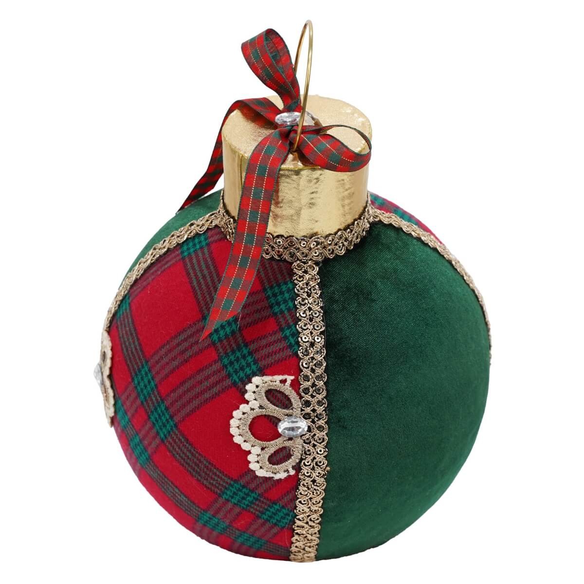 Palla di Natale in Tessuto Vellutato Ø20 cm – Rosso, Verde e Oro con Motivo Scozzese e Dettagli Dorati