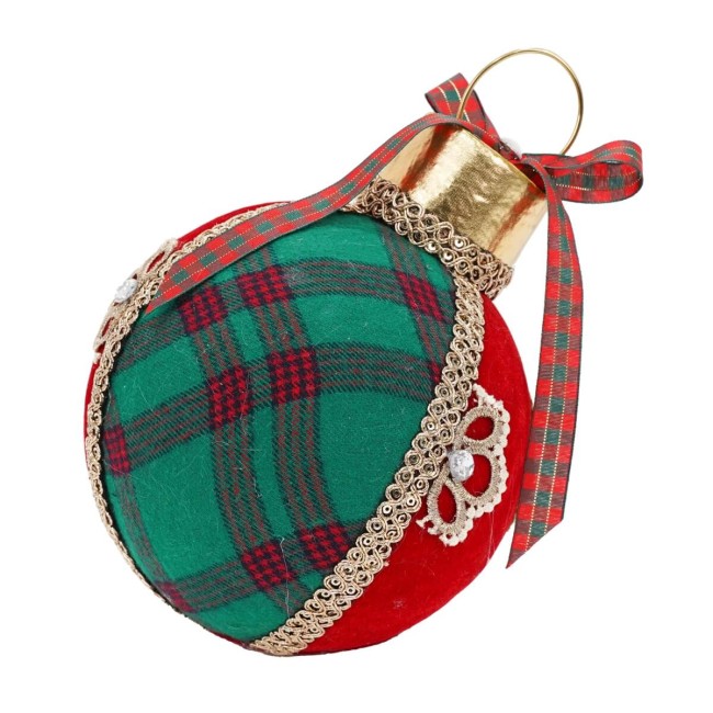 Palla di Natale Decorativa Ø25 cm in Tessuto Tartan – Rosso, Verde e Oro con Velluto e Merletti