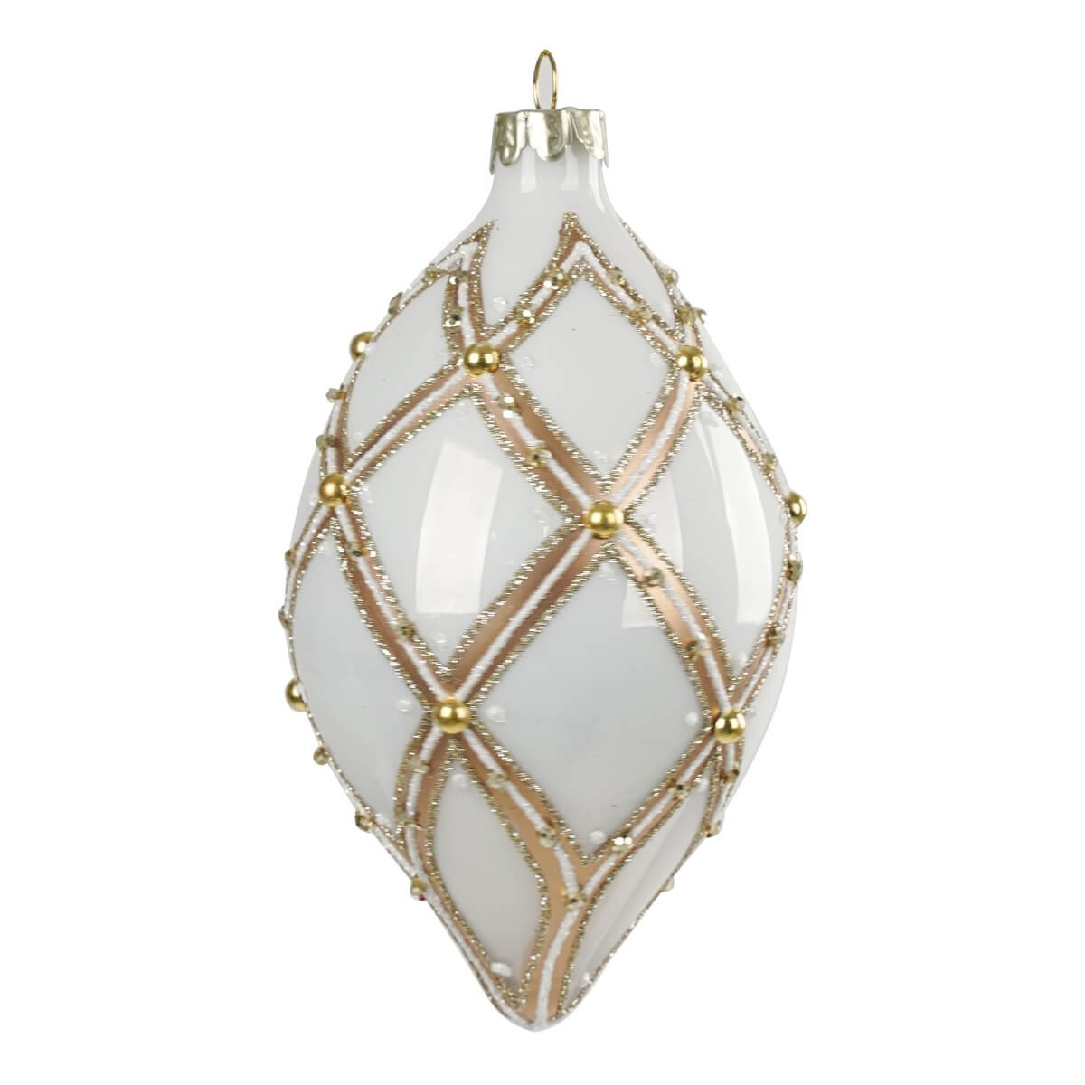Aggiungi un tocco di raffinatezza al tuo albero di Natale con questa splendida goccia natalizia in vetro decorata nei toni del bianco perla e dell’oro brillante. Con il suo design elegante a losanghe impreziosito da glitter e perline dorate, è la scelta perfetta per allestimenti natalizi chic e di classe.