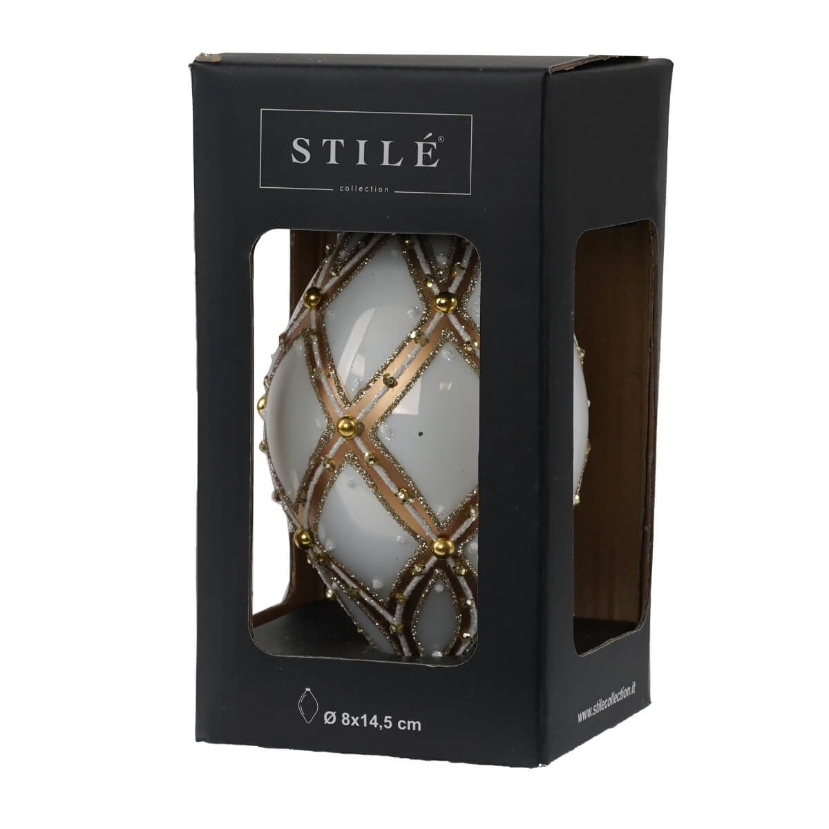 Realizzata in vetro di alta qualità, questa decorazione da appendere si distingue per le sue dimensioni armoniose (Ø 8 x H 14,5 cm), ideali sia per alberi di grandi dimensioni sia per allestimenti su rami, ghirlande o composizioni decorative. La confezione singola, firmata Stilè Collection, la rende perfetta anche come idea regalo raffinata.