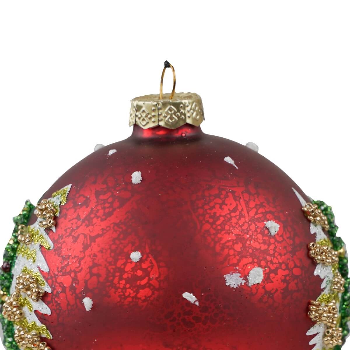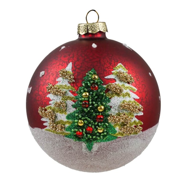 Dona un tocco di magia al tuo Natale con questa raffinata palla natalizia decorata in vetro, dal diametro di 10 cm. La superficie rossa satinata è arricchita da un'incantevole scena in rilievo con alberi di Natale innevati, perle dorate e dettagli glitterati in verde e oro, che evocano l’atmosfera calda delle festività.