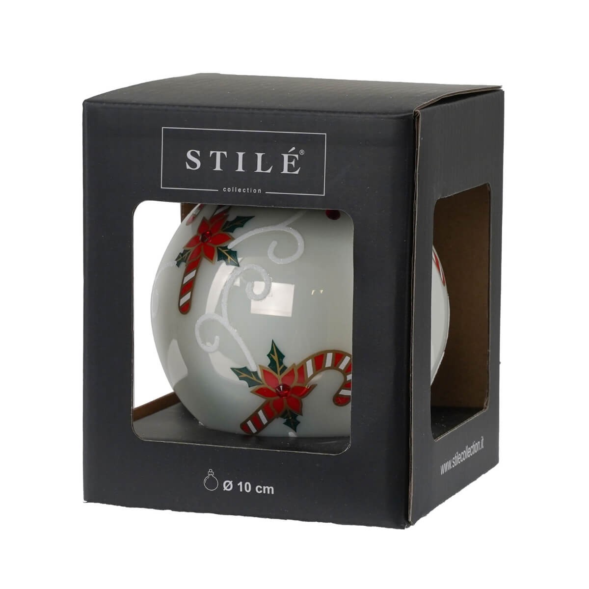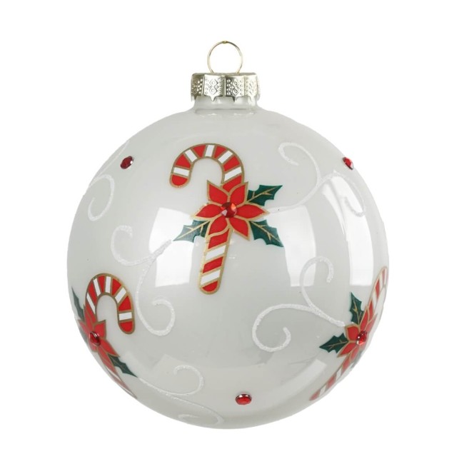 Dona un tocco di tradizione e raffinatezza al tuo albero con questa palla natalizia decorata in vetro, impreziosita da bastoncini di zucchero, stelle di Natale rosse e dettagli glitterati. La superficie lucida e il design festivo rendono questa decorazione perfetta per impreziosire ogni ambiente durante le feste.