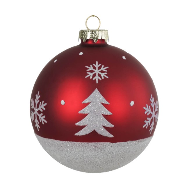 Cattura la magia delle feste con questa suggestiva pallina di Natale decorata in vetro rosso opaco, impreziosita da eleganti dettagli bianchi glitterati che rappresentano un paesaggio invernale con alberi, fiocchi di neve e una base effetto neve scintillante.