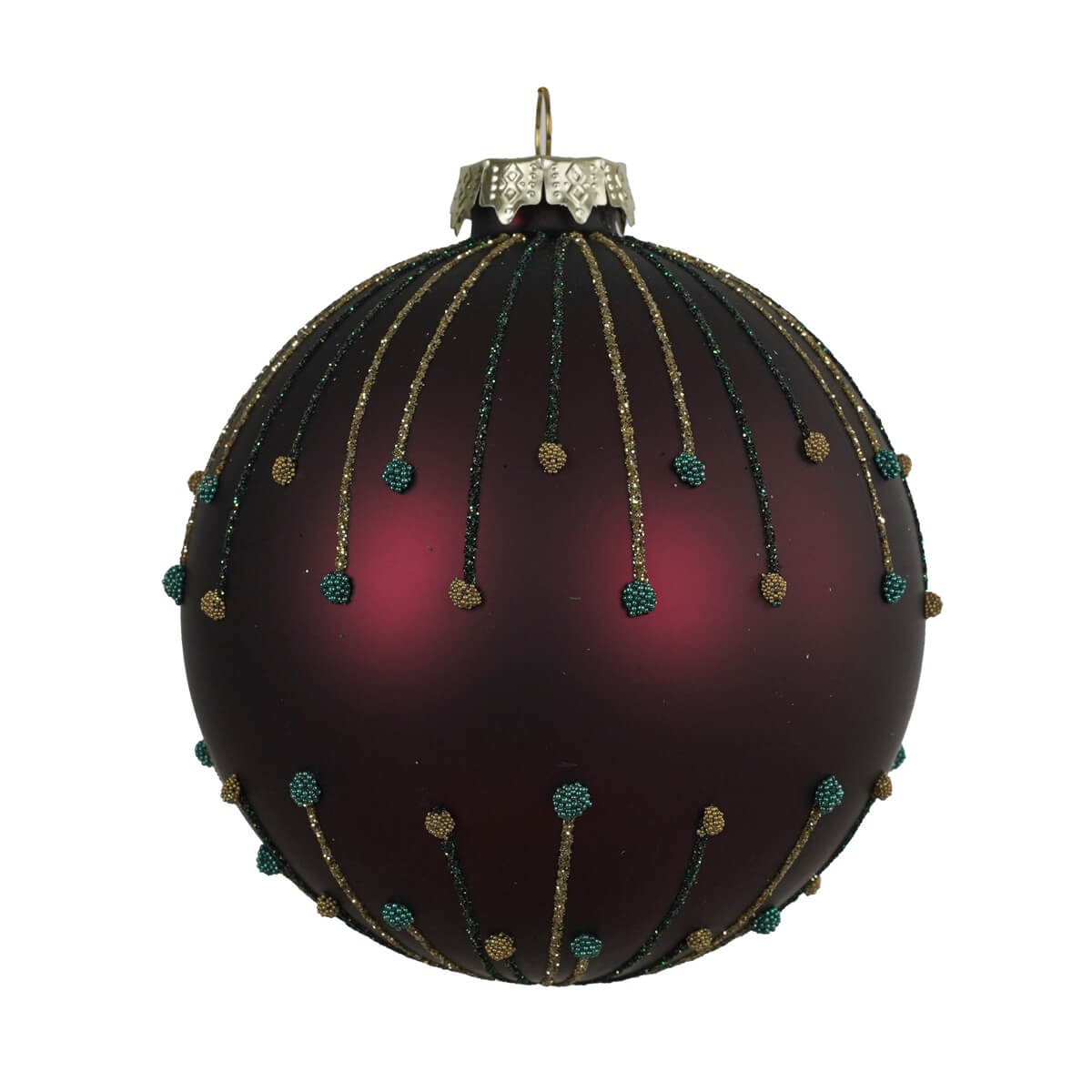 Pallina di Natale in Vetro Bordeaux con Righe Glitter Oro e Verde – Ø 8 cm / 10 cm