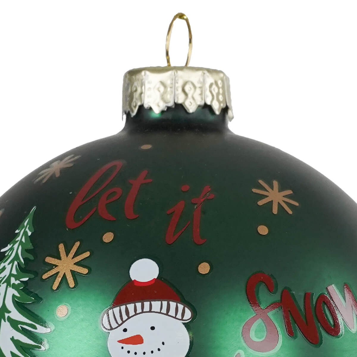Porta una ventata di allegria e spirito natalizio al tuo albero con questa vivace pallina di Natale decorata in vetro, dal fondo verde satinato. Al centro della scena, un simpatico pupazzo di neve con sciarpa rossa a stelle, un albero innevato e la scritta “Let it Snow!” in caratteri festosi. Il tutto è arricchito da fiocchi di neve dorati e dettagli allegri che evocano la magia dell’inverno.
