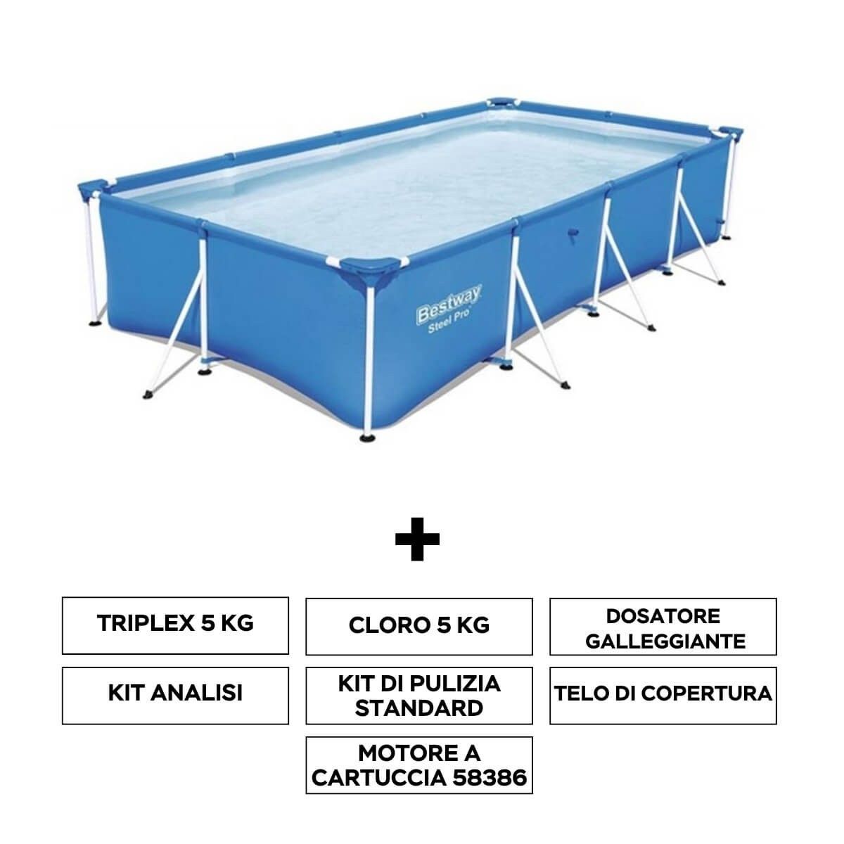 Piscina fuori terra rettangolare di dimensioni 400x211x H 81 cm, caratterizzata da un telaio galvanizzato trattato antiruggine, con liner extra resistente formato da 3 strati di materiale separati: lo strato interno di maglia di poliestere è saldato in maniera industriale ai due strati esterni costituiti da un resistente e spesso strato di PVC.