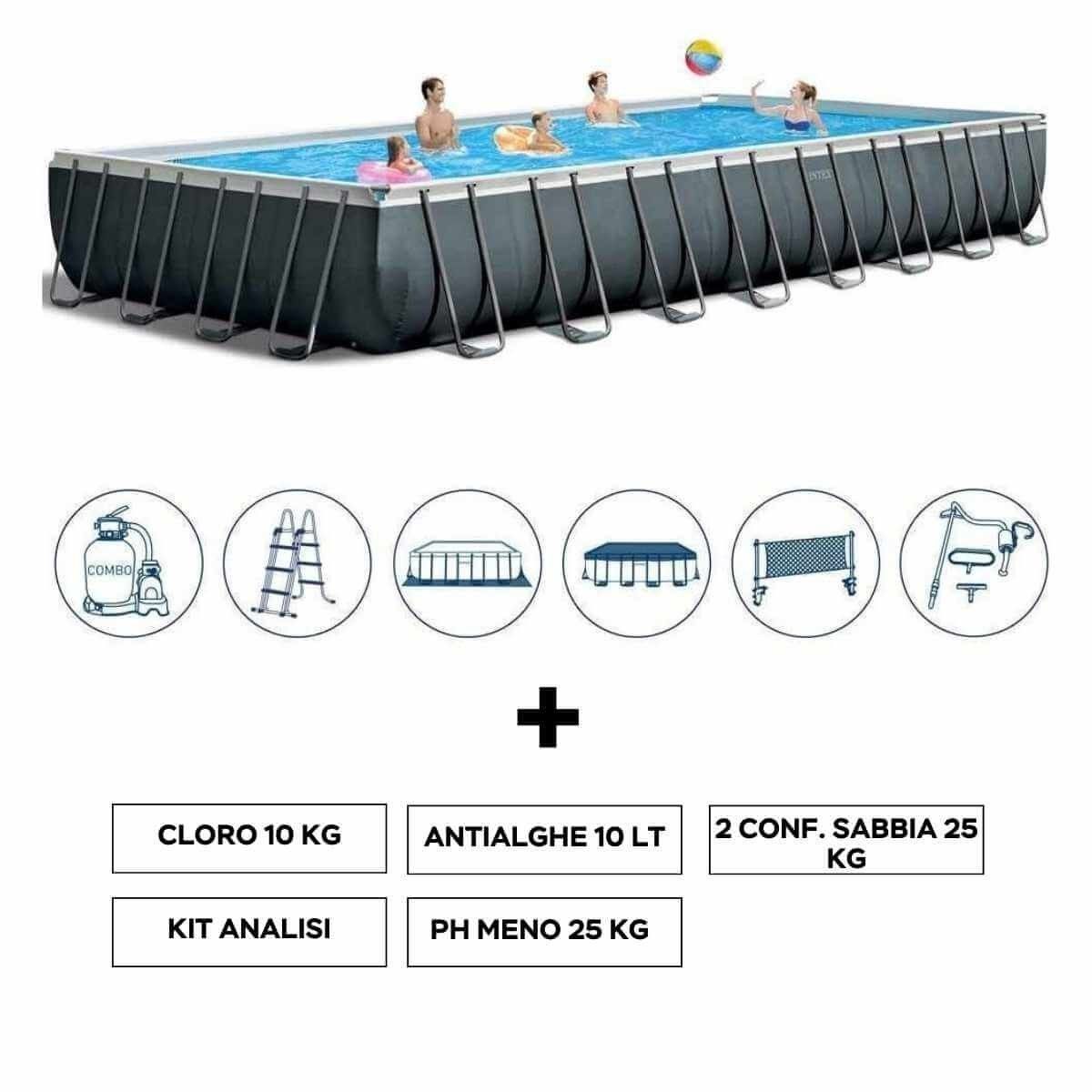 La confezione include una pompa a sabbia combo Sale/Cloro (portata 10,0m3/h), una scaletta doppia rampa, un telo base, un telo di copertura, rete volleyball e kit di pulizia deluxe con skimmer.
