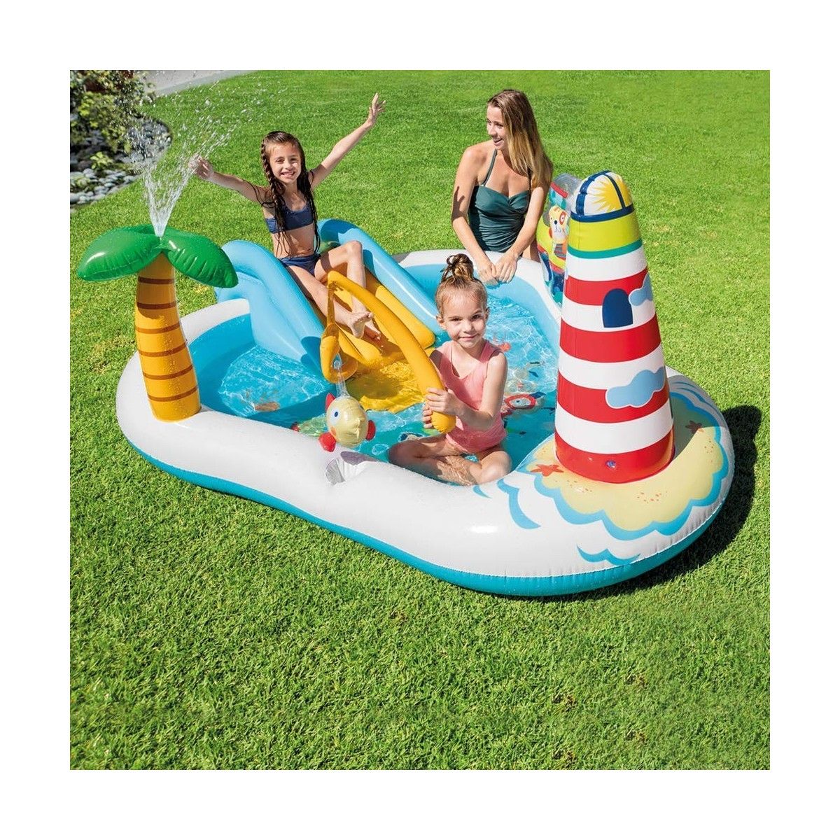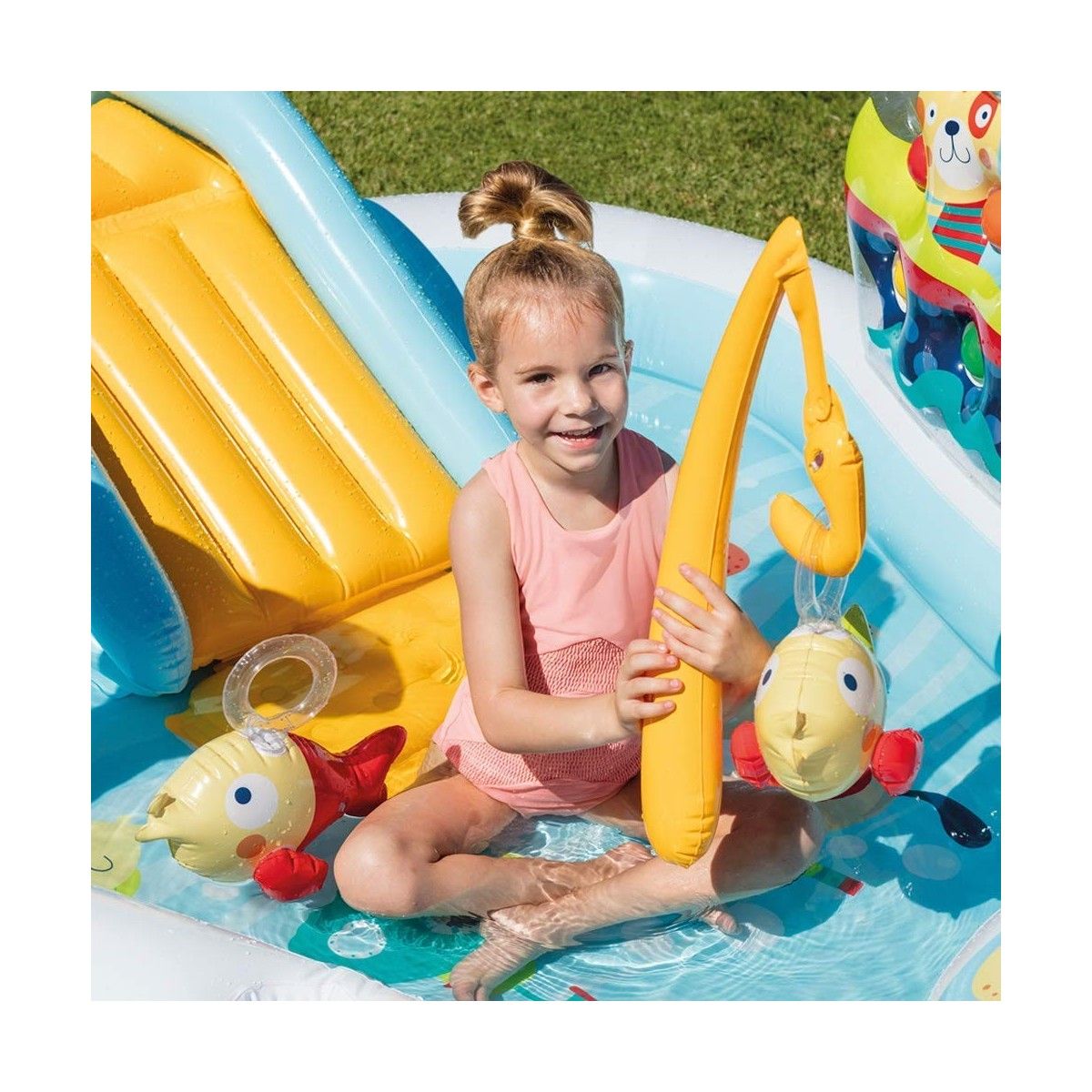 Preparatevi a immergervi in un mondo di avventure acquatiche senza limiti, dove i vostri piccoli potranno divertirsi come mai prima d'ora. Questa piscina è dotata di uno scivolo emozionante, che garantirà momenti di pura gioia mentre i vostri bambini scendono a tutta velocità nell'acqua rinfrescante. Inoltre, la doccia a palma aggiunge un tocco di freschezza e divertimento, spruzzando acqua dolcemente sui vostri piccoli esploratori. La nostra piscina è realizzata totalmente in vinile ad alta resistenza, garantendo un prodotto di qualità che durerà nel tempo. All'interno della confezione troverete una simpatica canna da pesca e due pesciolini gonfiabili, che aggiungeranno un elemento di sfida e divertimento al gioco dei vostri bambini.