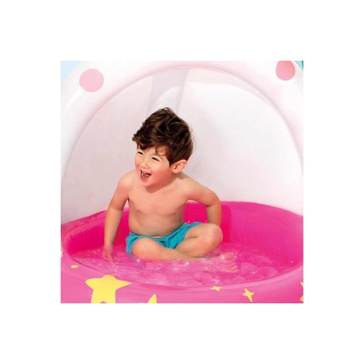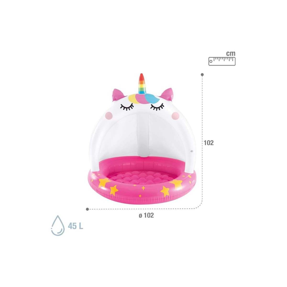 Esplora il magico mondo dell'estate con la Piscina Gonfiabile Unicorno Intex progettata per portare il divertimento a casa tua, questa adorabile piscina è perfetta per i piccoli esploratori di età 1-3 anni. Con un diametro di 102 cm, la Piscina Gonfiabile Unicorno offre una capacità d'acqua di 45 litri, creando un'oasi di freschezza per i tuoi bambini nei caldi giorni estivi. La piscina è dotata di una tettoia parasole integrata, offrendo una protezione solare ideale per i più piccoli.