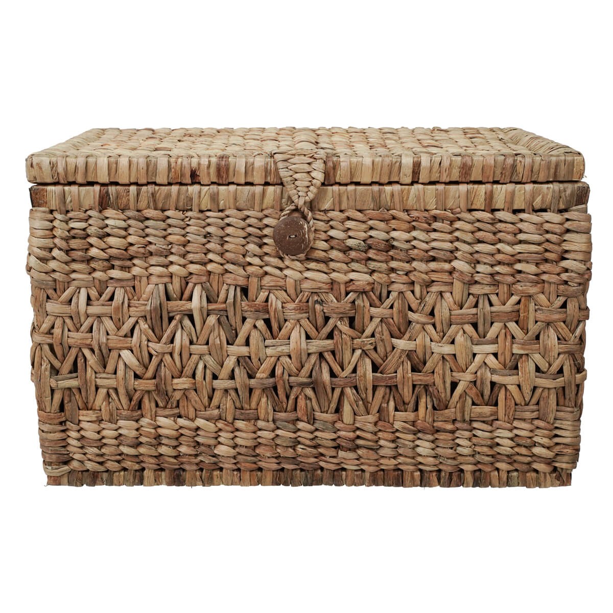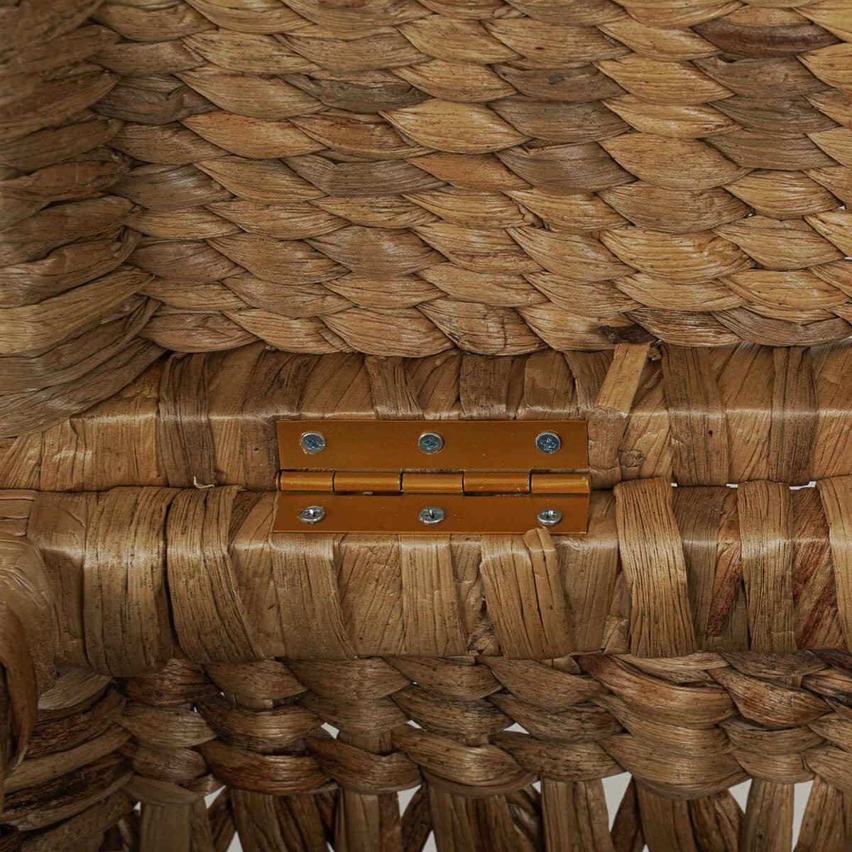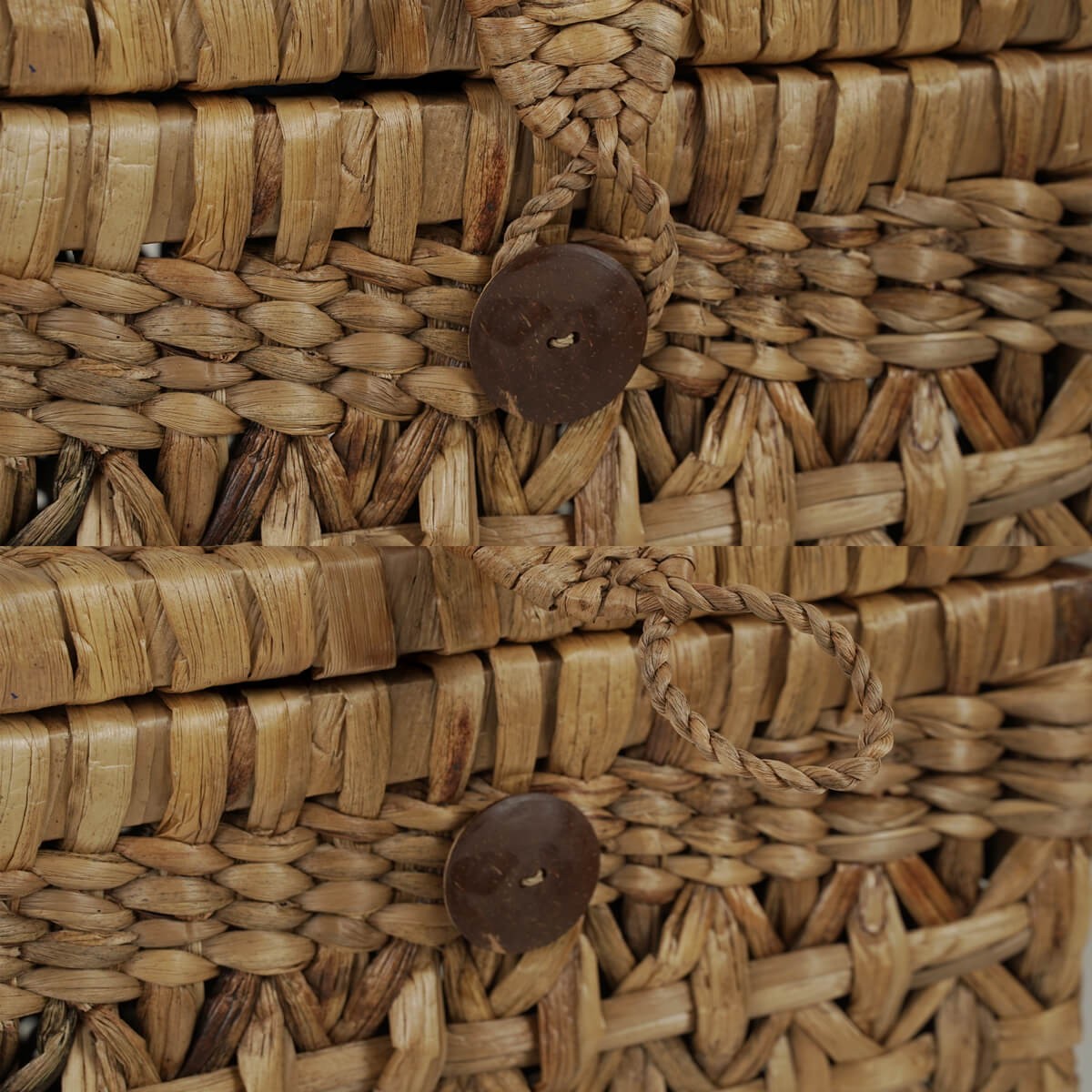 La lavorazione intrecciata del giacinto d’acqua dona ai bauli un aspetto unico, con motivi decorativi a rilievo che li rendono perfetti da esporre anche in soggiorni, camere da letto, ingressi o ambienti rustici e boho. I coperchi con chiusura ad asola li rendono pratici e sicuri, mantenendo il contenuto al riparo da polvere e sguardi indiscreti.