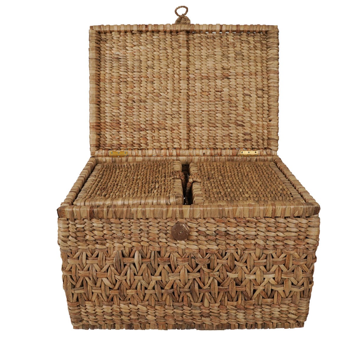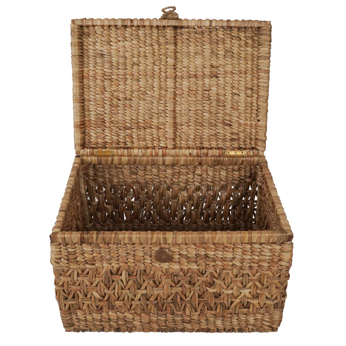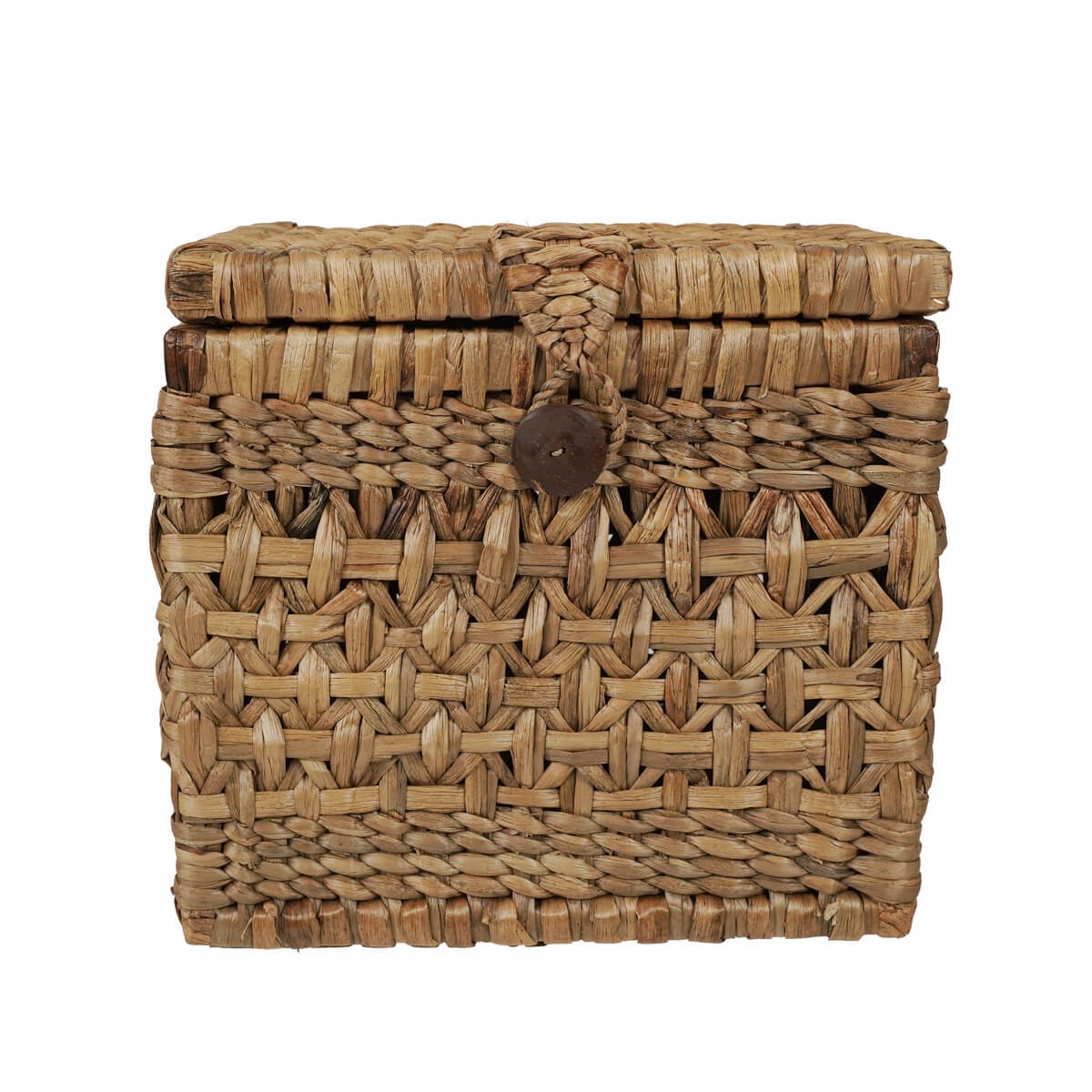 La lavorazione intrecciata del giacinto d’acqua dona ai bauli un aspetto unico, con motivi decorativi a rilievo che li rendono perfetti da esporre anche in soggiorni, camere da letto, ingressi o ambienti rustici e boho. I coperchi con chiusura ad asola li rendono pratici e sicuri, mantenendo il contenuto al riparo da polvere e sguardi indiscreti.