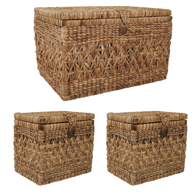 Funzionali e decorativi, i bauli in giacinto d’acqua intrecciato sono l’elemento d’arredo perfetto per chi cerca ordine, stile e materiali naturali in un’unica soluzione. Questo set da tre pezzi con coperchio è ideale per contenere biancheria, coperte, giochi, riviste o accessori, offrendo al contempo un tocco caldo e artigianale all’ambiente.