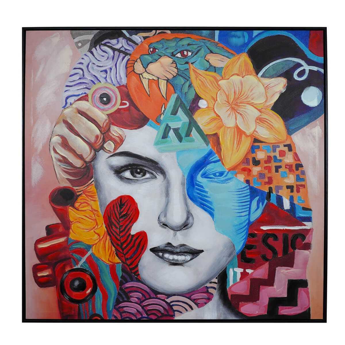 Questo quadro può essere interpretato come un'esplorazione della complessità e della ricchezza dell'identità umana. Il volto centrale rappresenta l'essenza dell'individuo, mentre gli elementi circostanti simboleggiano le diverse influenze e esperienze che modellano la personalità. Il leone può rappresentare forza e coraggio, il fiore la bellezza e la fragilità, mentre i motivi geometrici e astratti suggeriscono il caos e l'ordine che coesistono nella mente umana. L'uso del colore accentua l'energia e la vitalità dell'intera composizione.