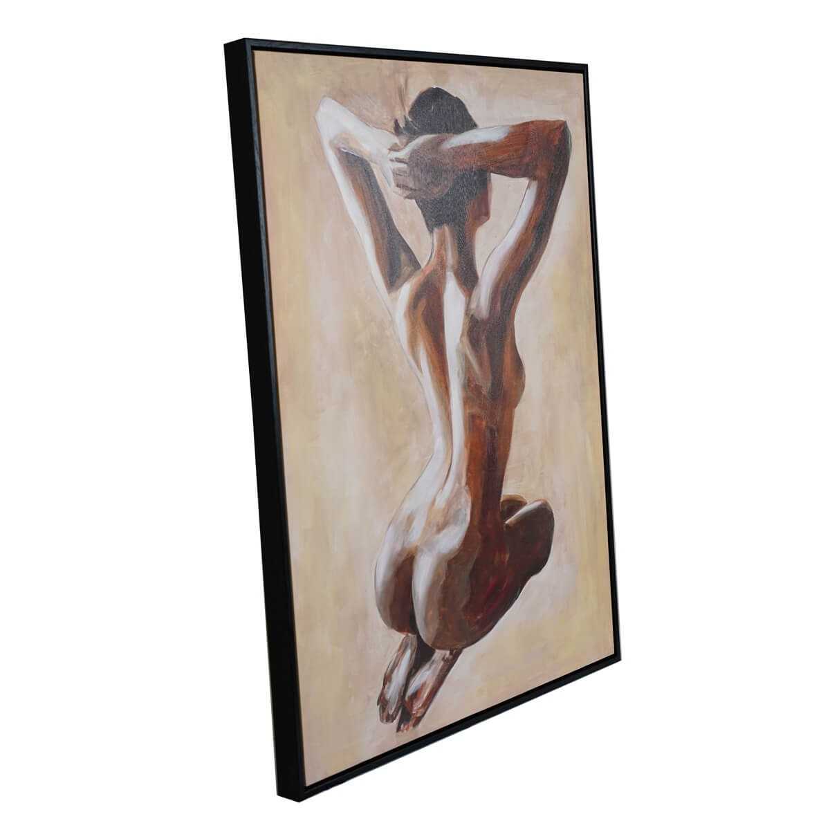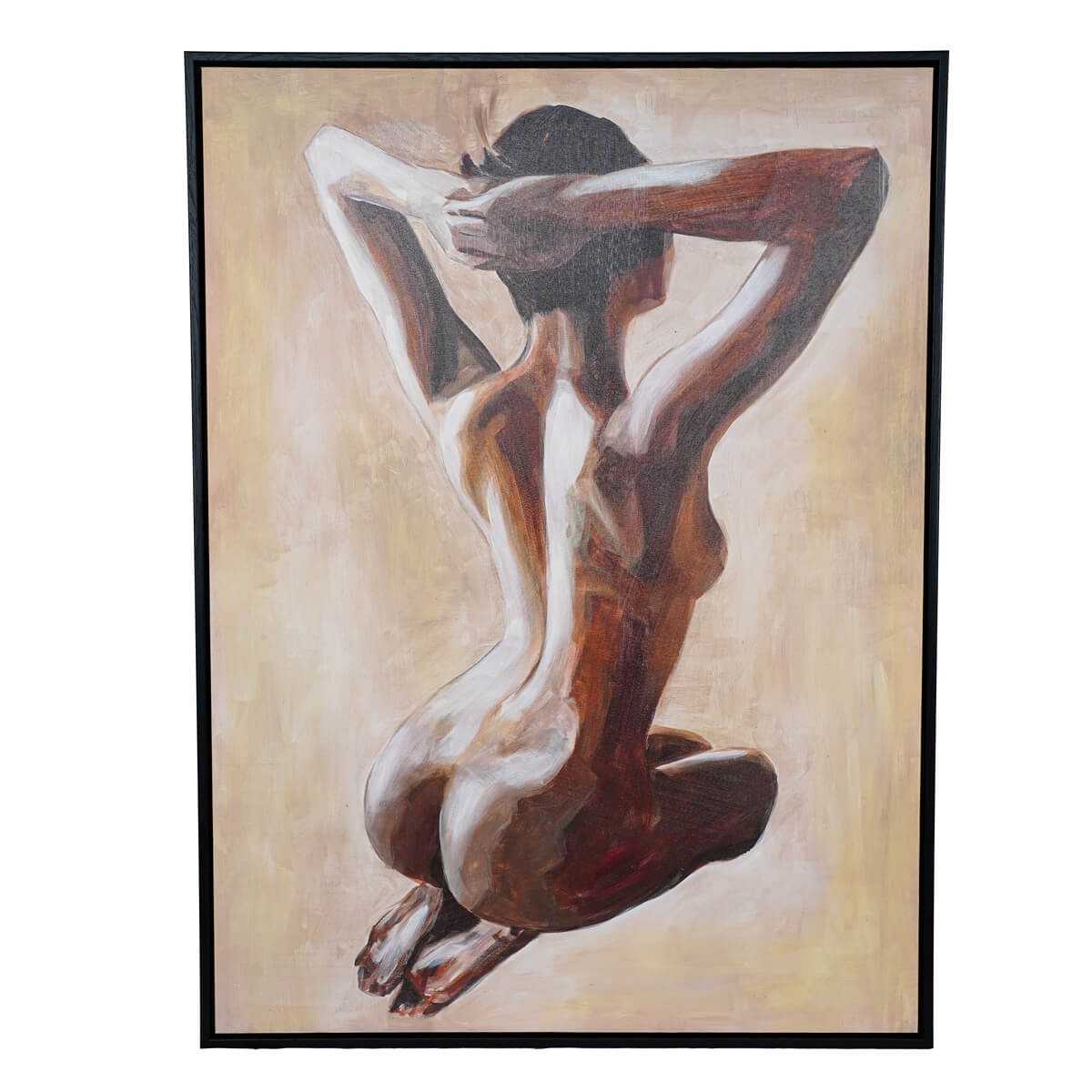 Il quadro raffigura una figura femminile di schiena, seduta in una posa rilassata con le braccia sollevate dietro la testa. L'uso delle tonalità calde e delle sfumature di marrone e beige conferisce alla figura un aspetto tridimensionale e realistico. La posa naturale e la scelta cromatica evocano una sensazione di intimità e tranquillità.