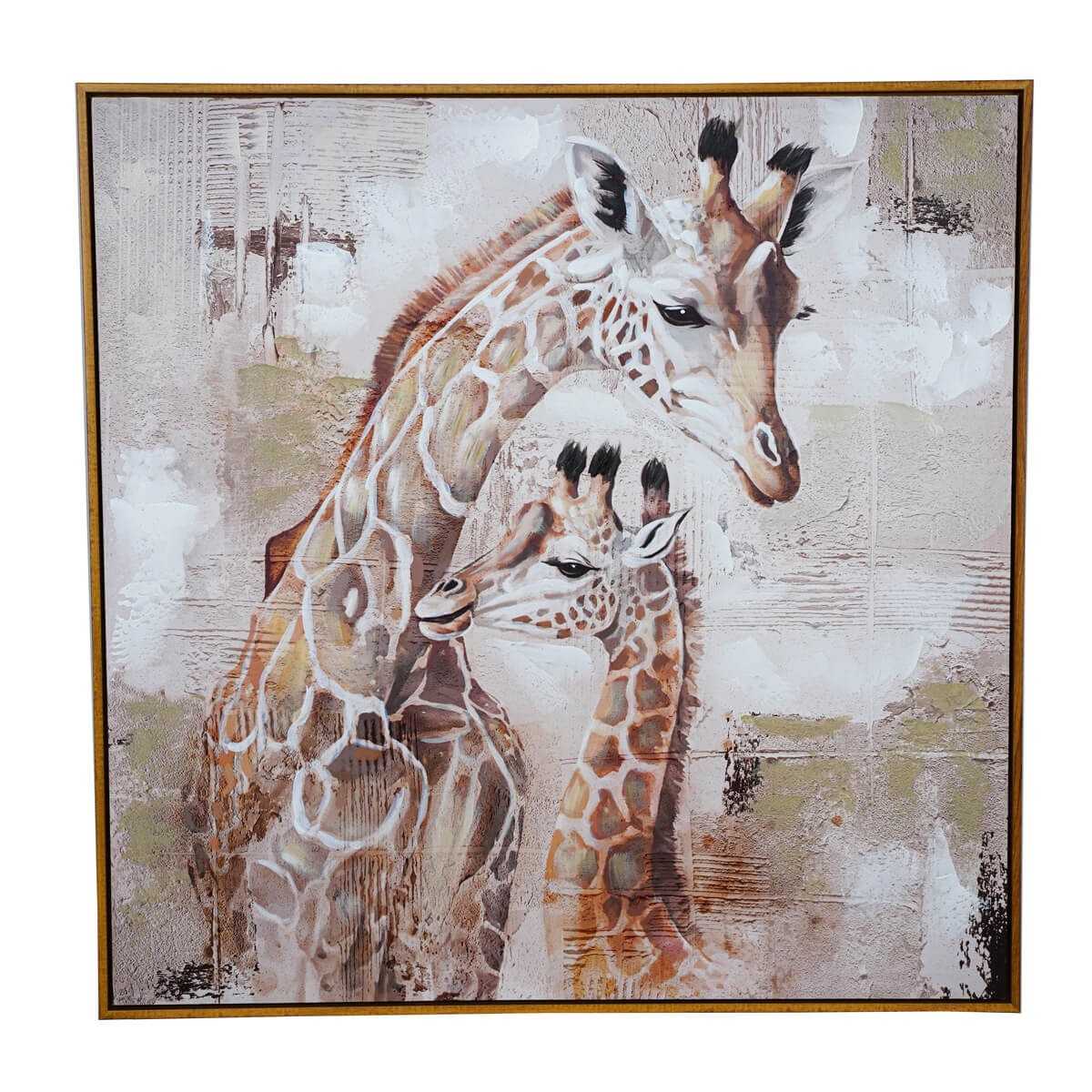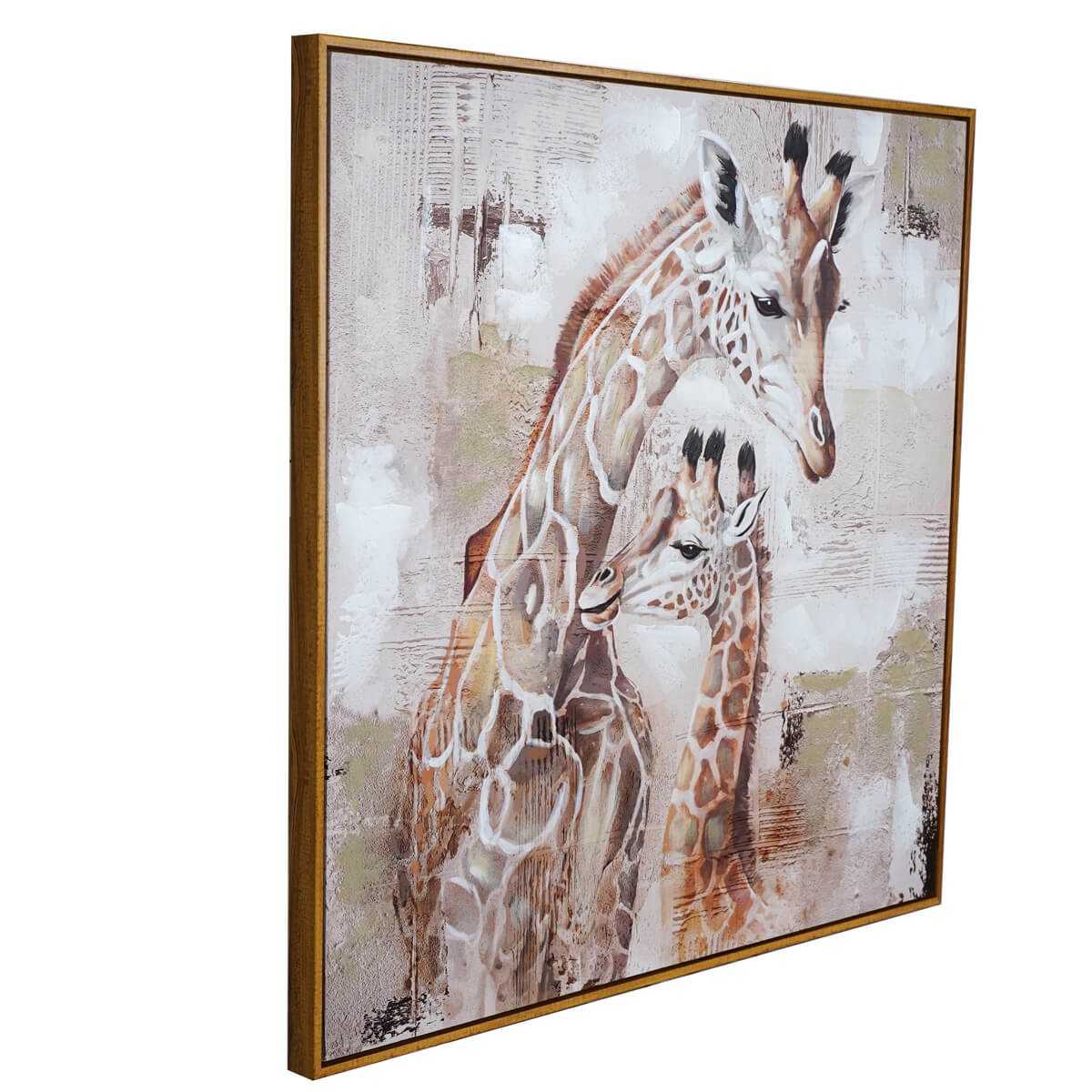 Ammira l'eleganza naturale del nostro quadro su tela 80x80 cm, dipinto a mano per l'80% e caratterizzato da un'incantevole raffigurazione di giraffe. Questo magnifico pezzo d'arte è incorniciato in una cornice di polistirene di colore marrone, con uno spessore di 3,5 cm, che aggiunge un tocco di calore e raffinatezza a qualsiasi ambiente.