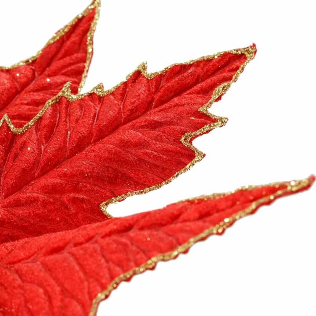 Raffinato ed elegante, questo fiore natalizio in velluto rosso con decori oro è la scelta ideale per impreziosire le tue decorazioni di Natale con uno stile classico e luminoso. Realizzato con finitura effetto velluto, si distingue per i dettagli dorati che ne esaltano le nervature, donando profondità e un tocco prezioso alla composizione.