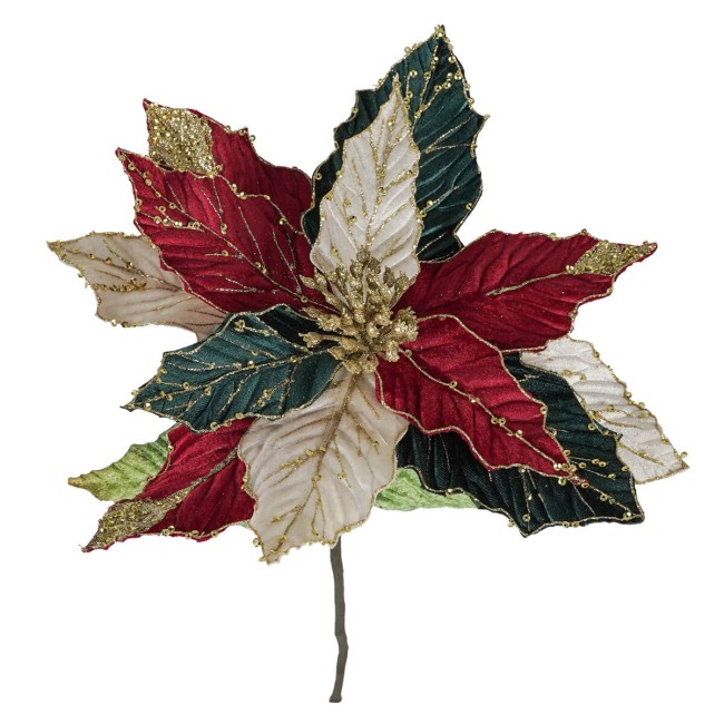 Aggiungi un tocco di eleganza e tradizione al tuo Natale con la poinsettia natalizia in velluto da 60 cm, un fiore decorativo raffinato che non può mancare nelle tue decorazioni festive. Realizzata in velluto di alta qualità, presenta petali nei colori classici del Natale – rosso, verde e bianco – impreziositi da luminosi dettagli dorati che riflettono la magia delle feste.