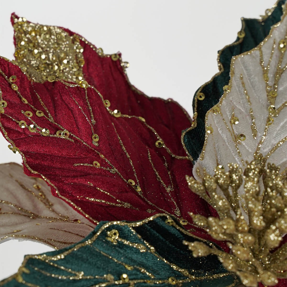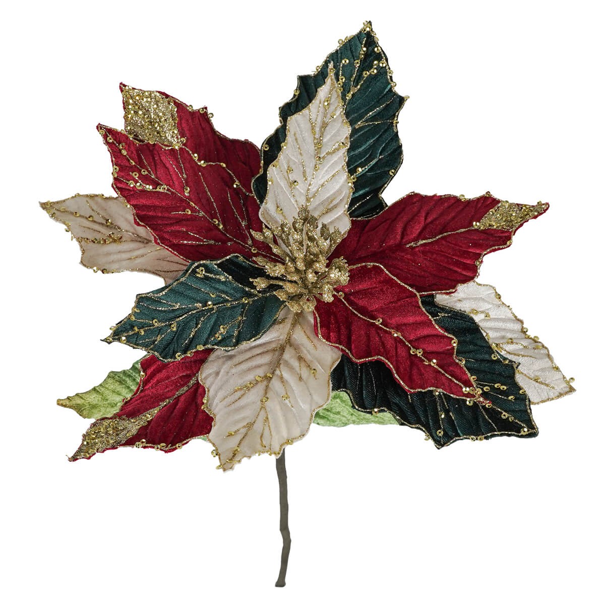 Poinsettia Natalizia in Velluto 60 cm – Fiore Decorativo Rosso, Verde e Bianco con Dettagli Dorati