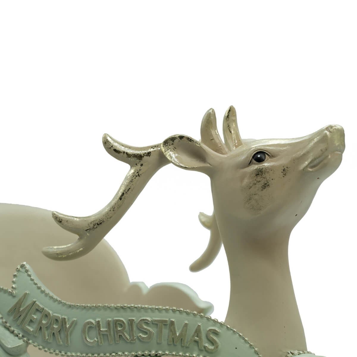 Slitta di Natale con Renna in Resina – 36 cm | Decorazione Beige e Verde Acqua con Scritta “Merry Christmas”
