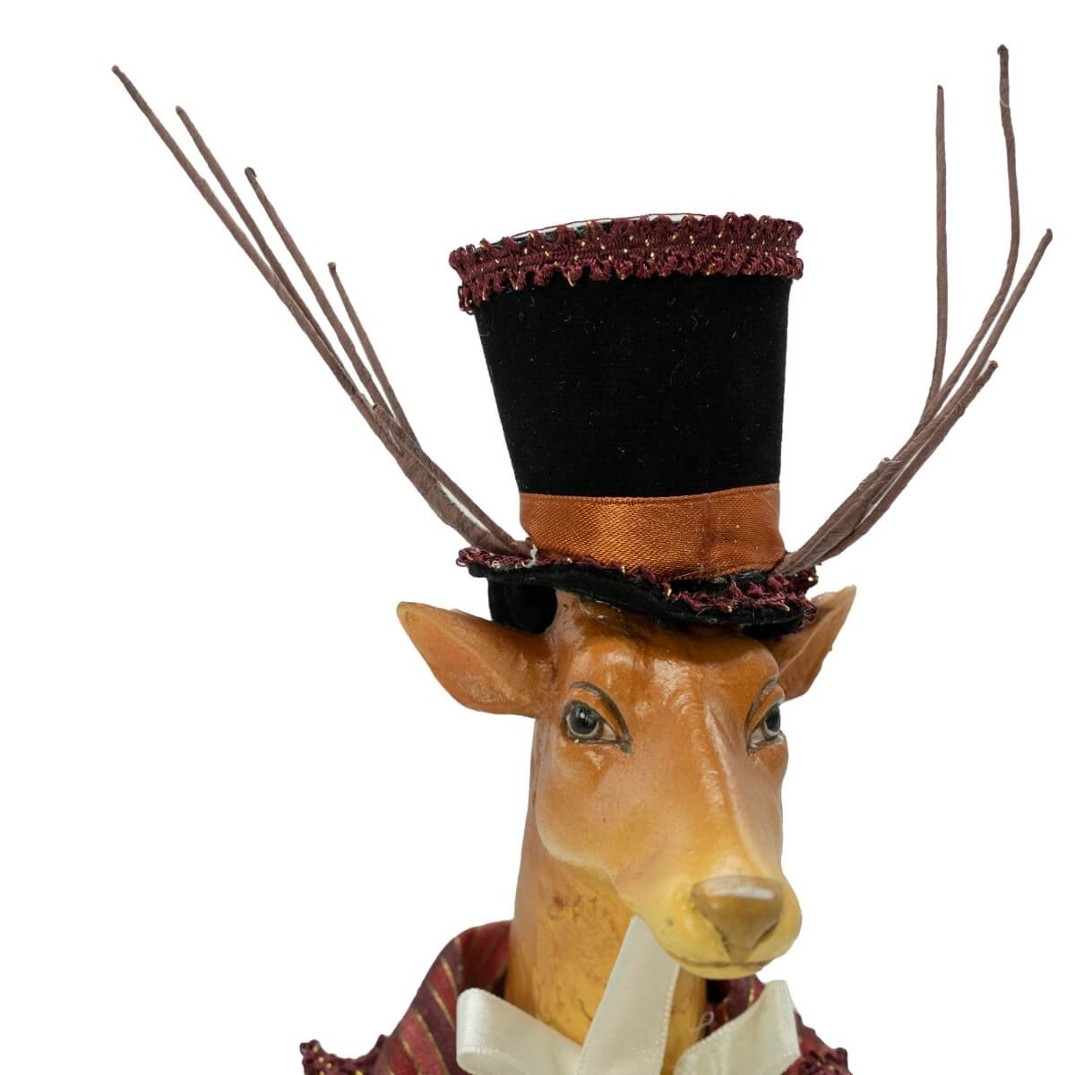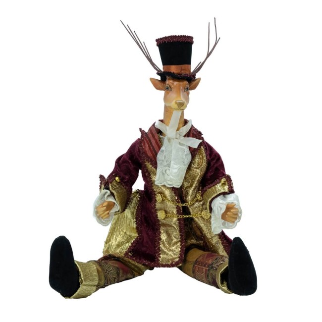 Trasforma i tuoi allestimenti natalizi con un tocco di classe: questa renna natalizia decorativa in posizione seduta conquista con il suo look aristocratico e raffinato. Indossa un prezioso abito in tessuto burgundy e oro, ricco di dettagli in stile barocco, con bottoni, fiocchi e finiture pregiate. Il cappello a cilindro completa il look con un tocco teatrale, perfetto per decorazioni di lusso, vetrine scenografiche o angoli tematici nel tuo ambiente natalizio.