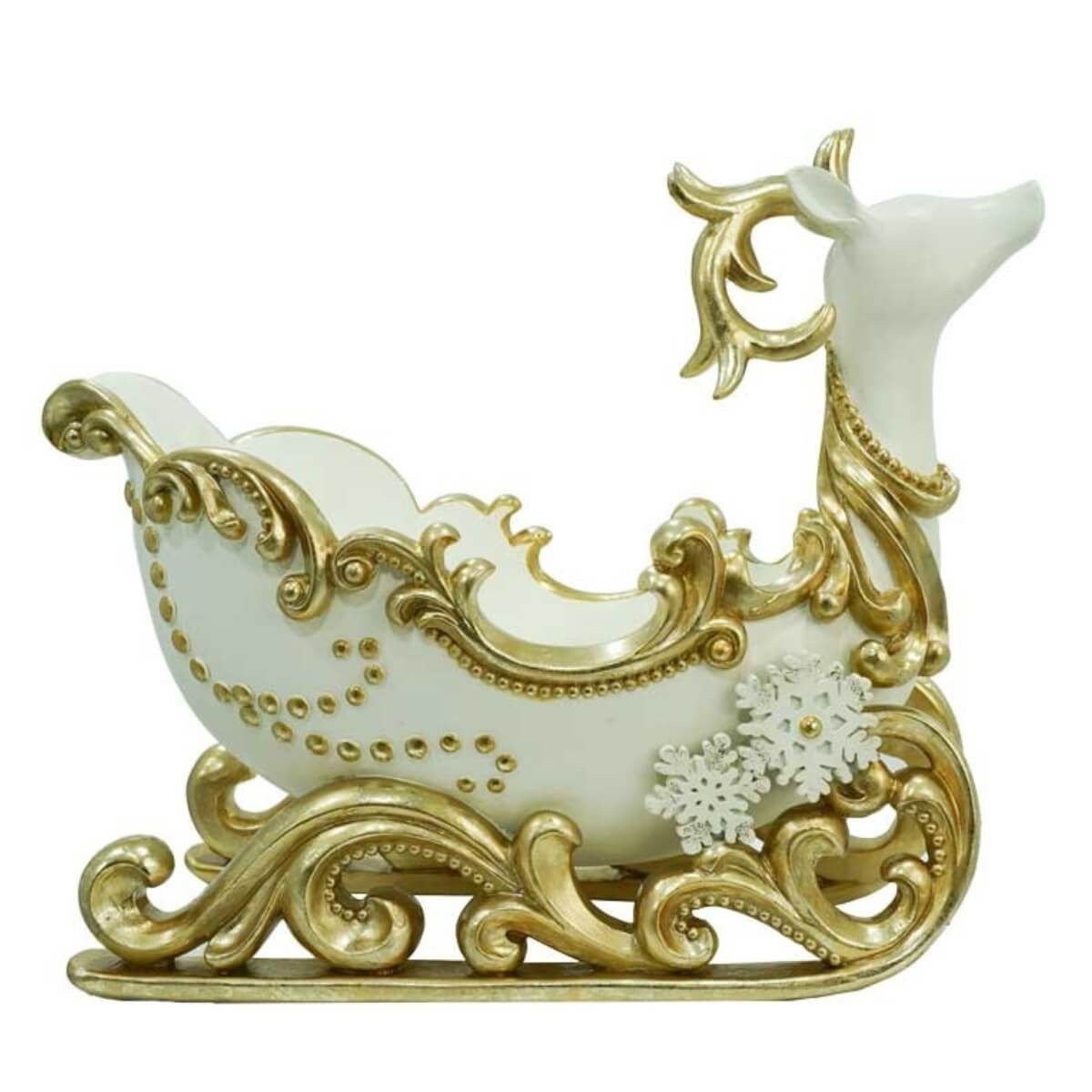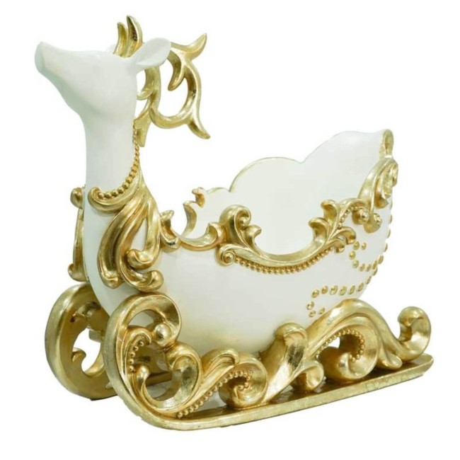 Realizzata in resina resistente e di alta qualità, la renna è dotata di un pratico vano contenitore integrato, perfetto per custodire piccoli oggetti, dolci, decorazioni o accessori natalizi. Le linee armoniose, le decorazioni dorate in rilievo e la slitta finemente lavorata la rendono un elemento decorativo esclusivo, ideale come centrotavola, decorazione per credenze, ingressi o vetrine.