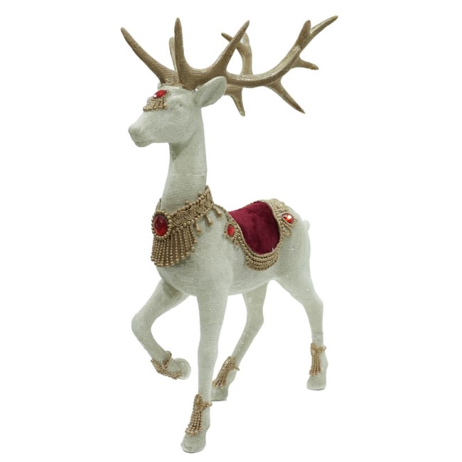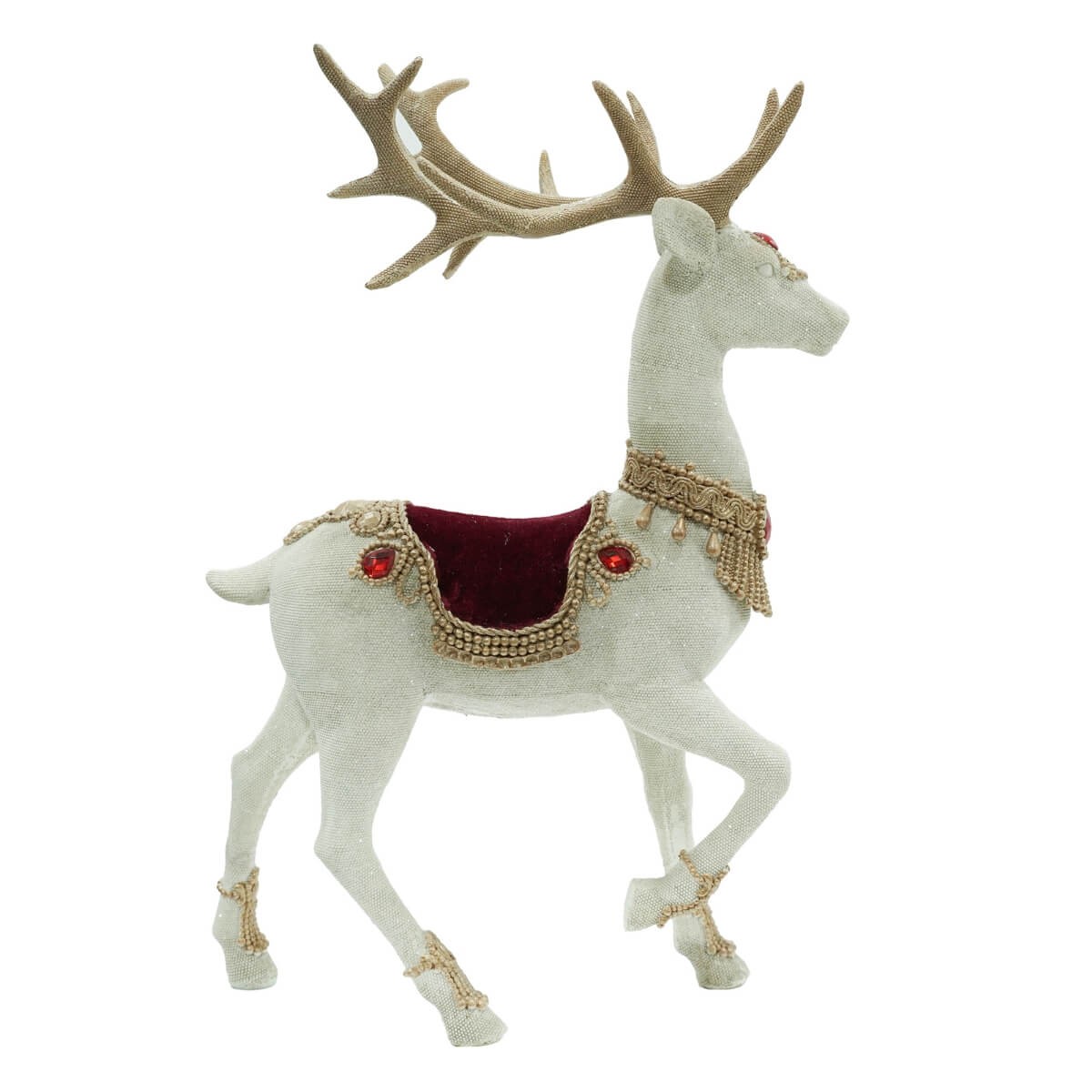 Renna Natalizia Elegante in Resina con Zampa Alzata – Bianco, Oro e Bordeaux H.39 cm