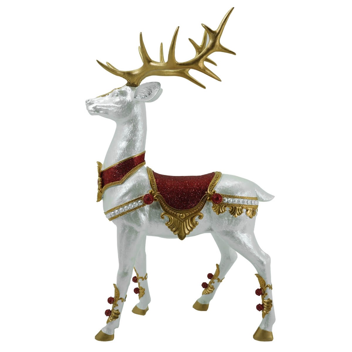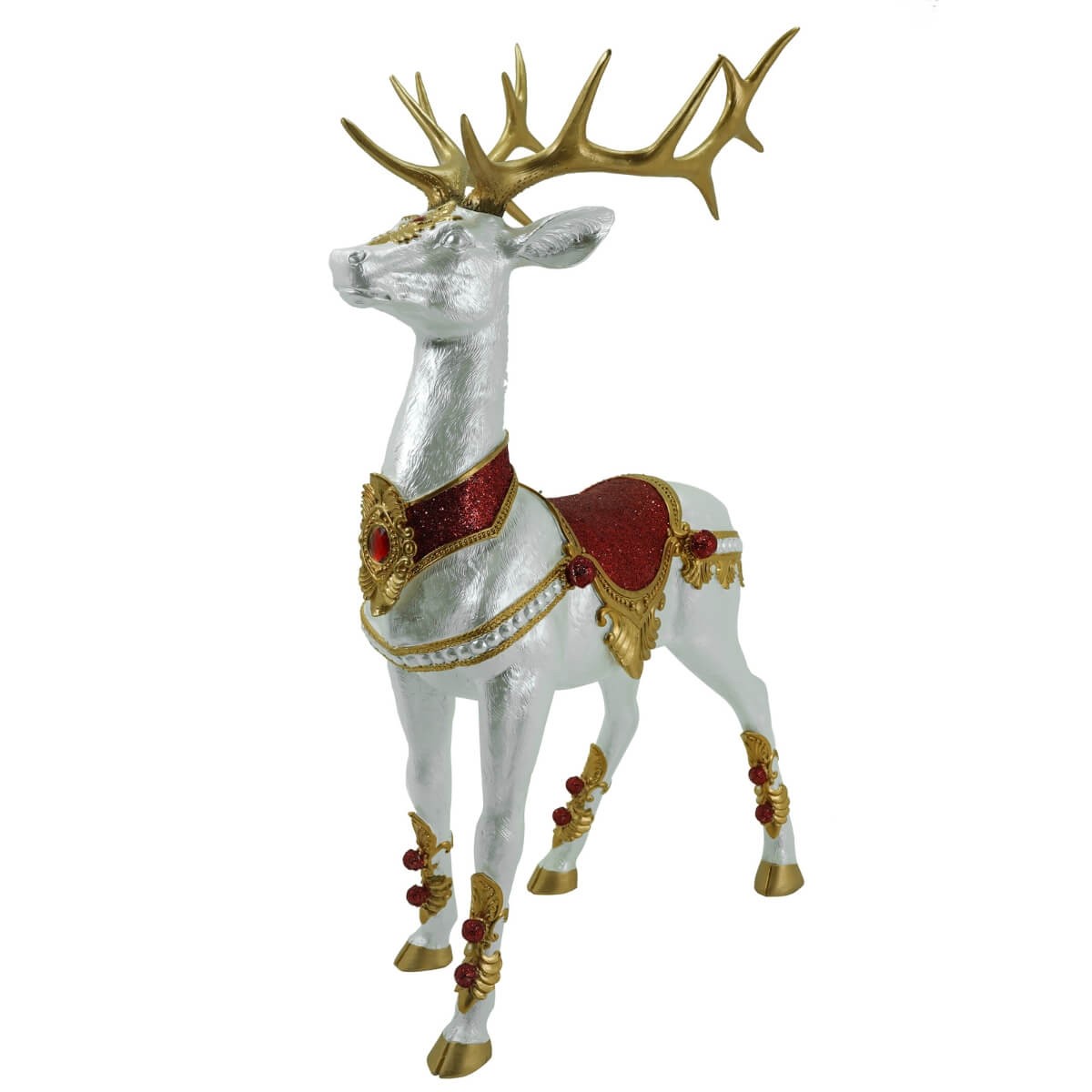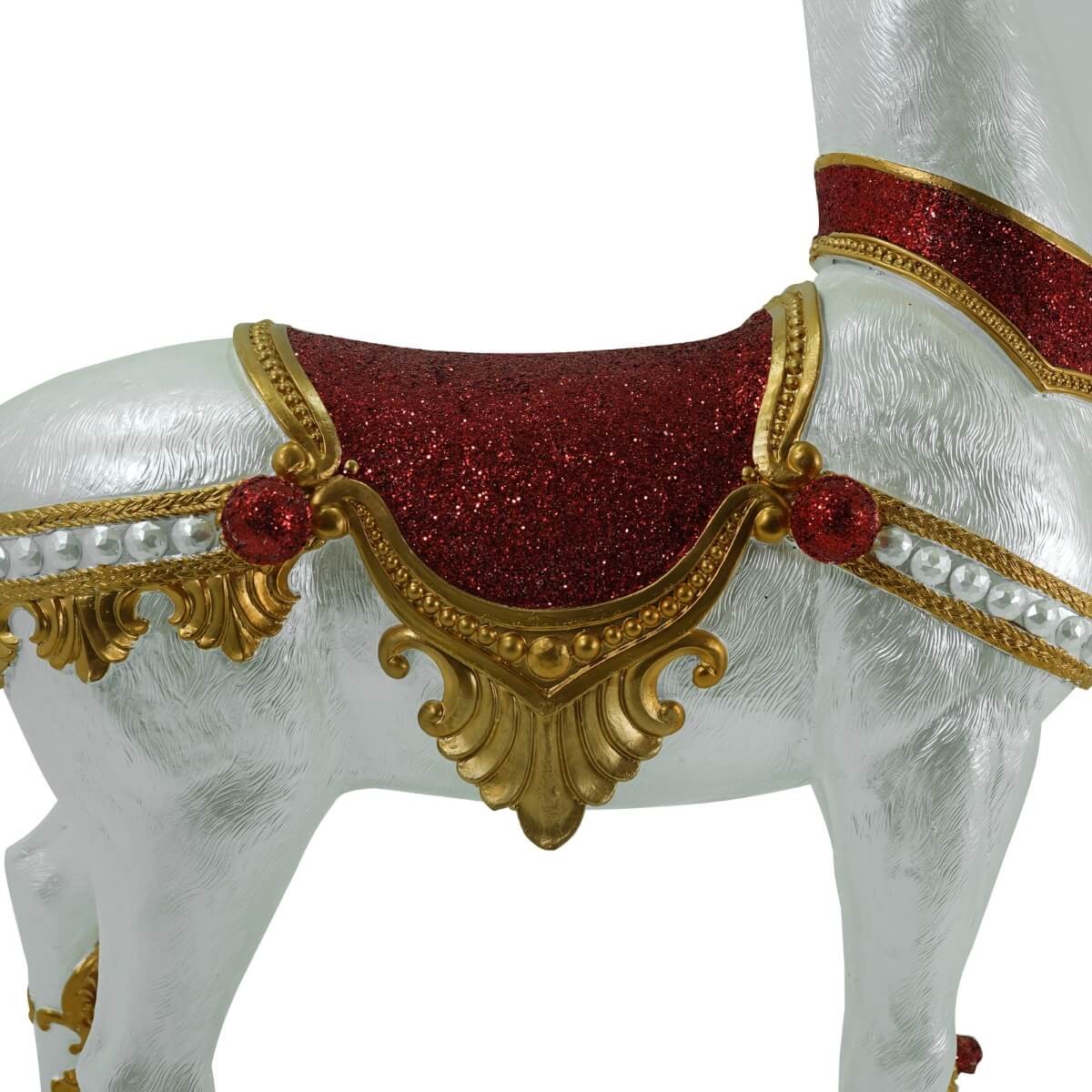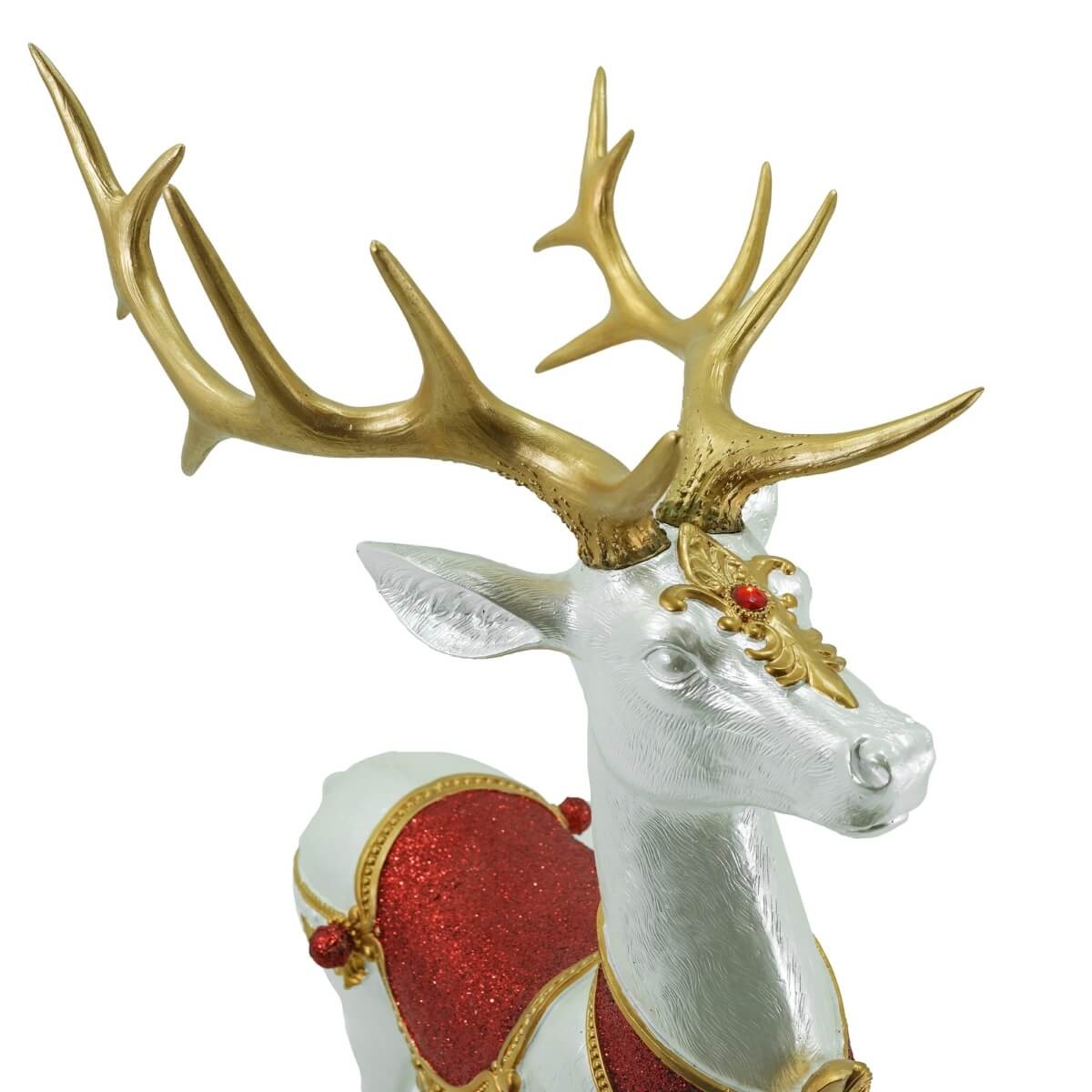 Ogni particolare è curato con massima attenzione, dalle corna dorate scolpite ai ricami effetto broccato sulla bardatura. Questo complemento d’arredo natalizio dona prestigio e calore a qualsiasi ambiente, diventando il protagonista assoluto delle tue feste.