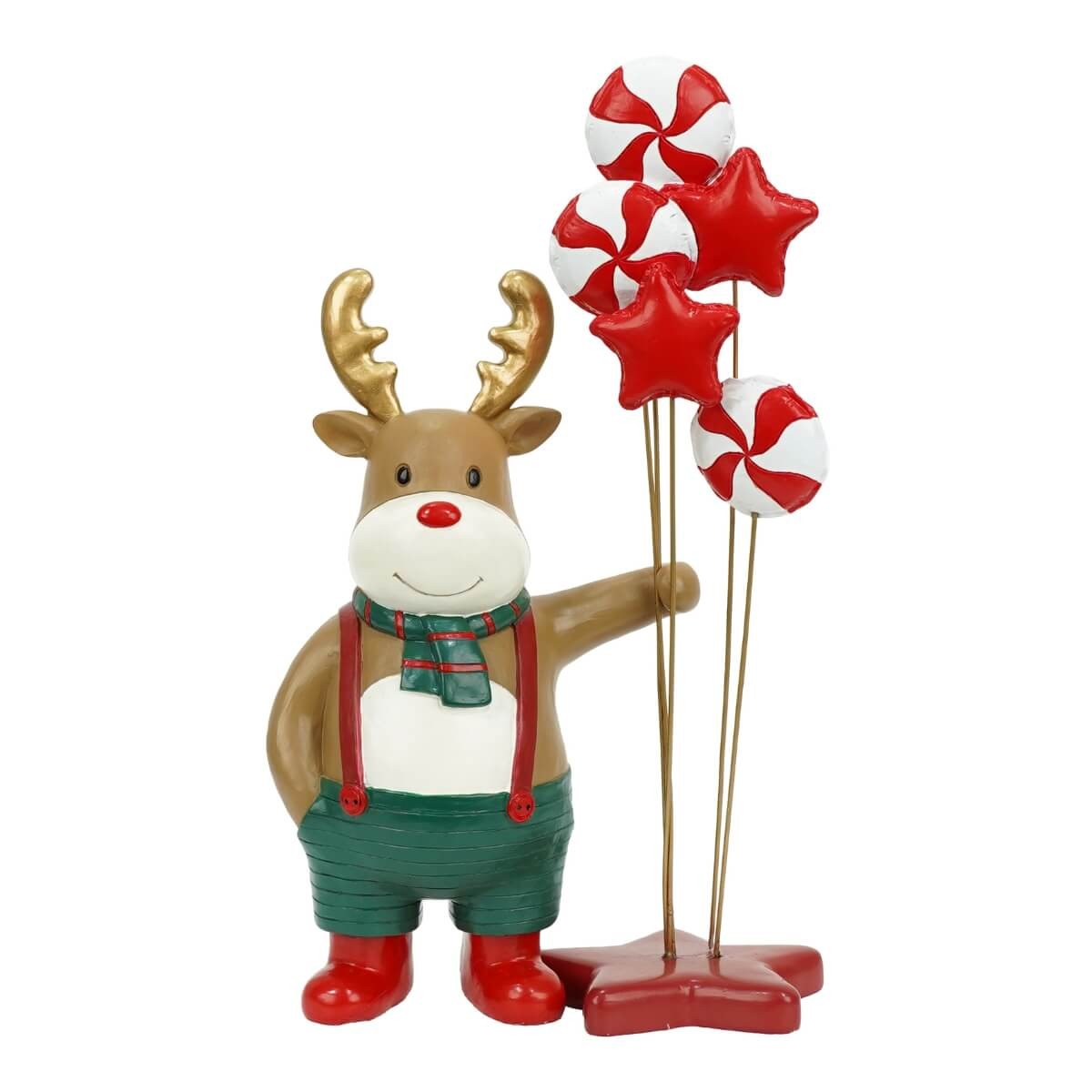 Grazie alle sue dimensioni compatte di 19 cm, questa renna si inserisce perfettamente su mensole, tavoli e angoli decorativi, portando un tocco giocoso e festoso a ogni ambiente. I palloncini a forma di stella e caramella completano la scena, rendendola una decorazione allegra e originale.