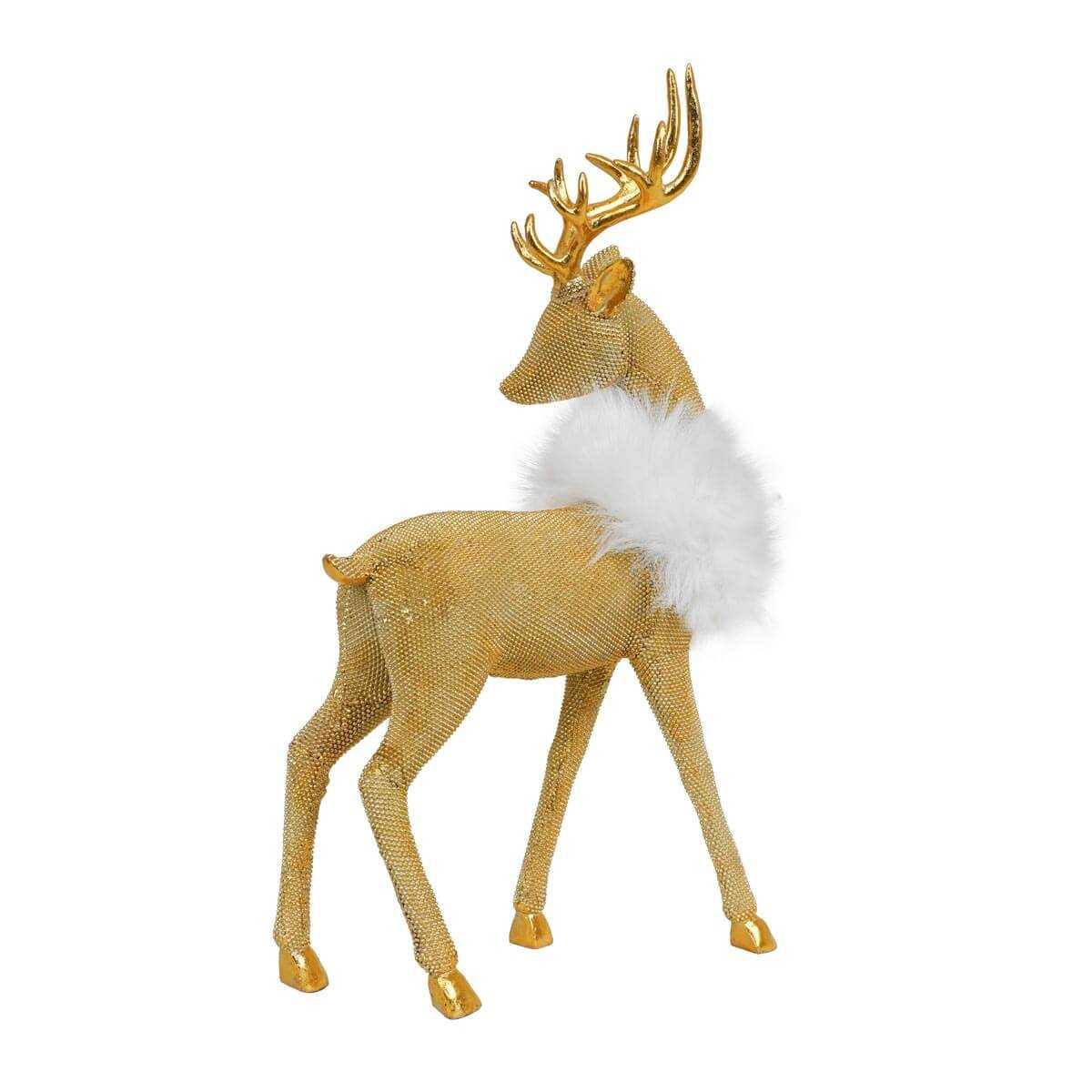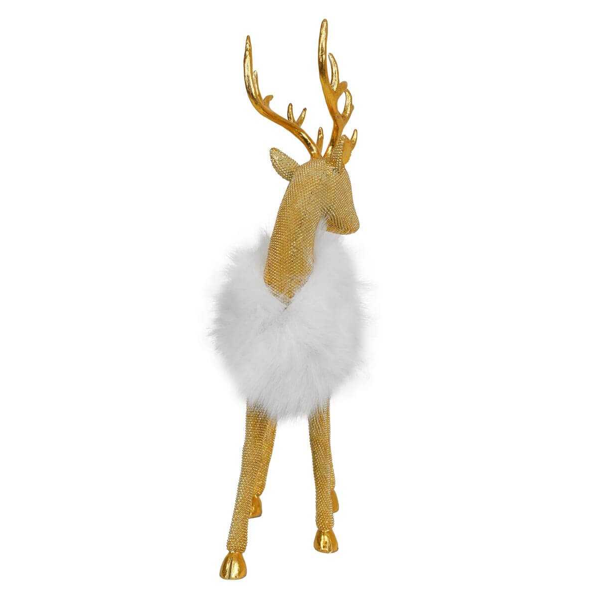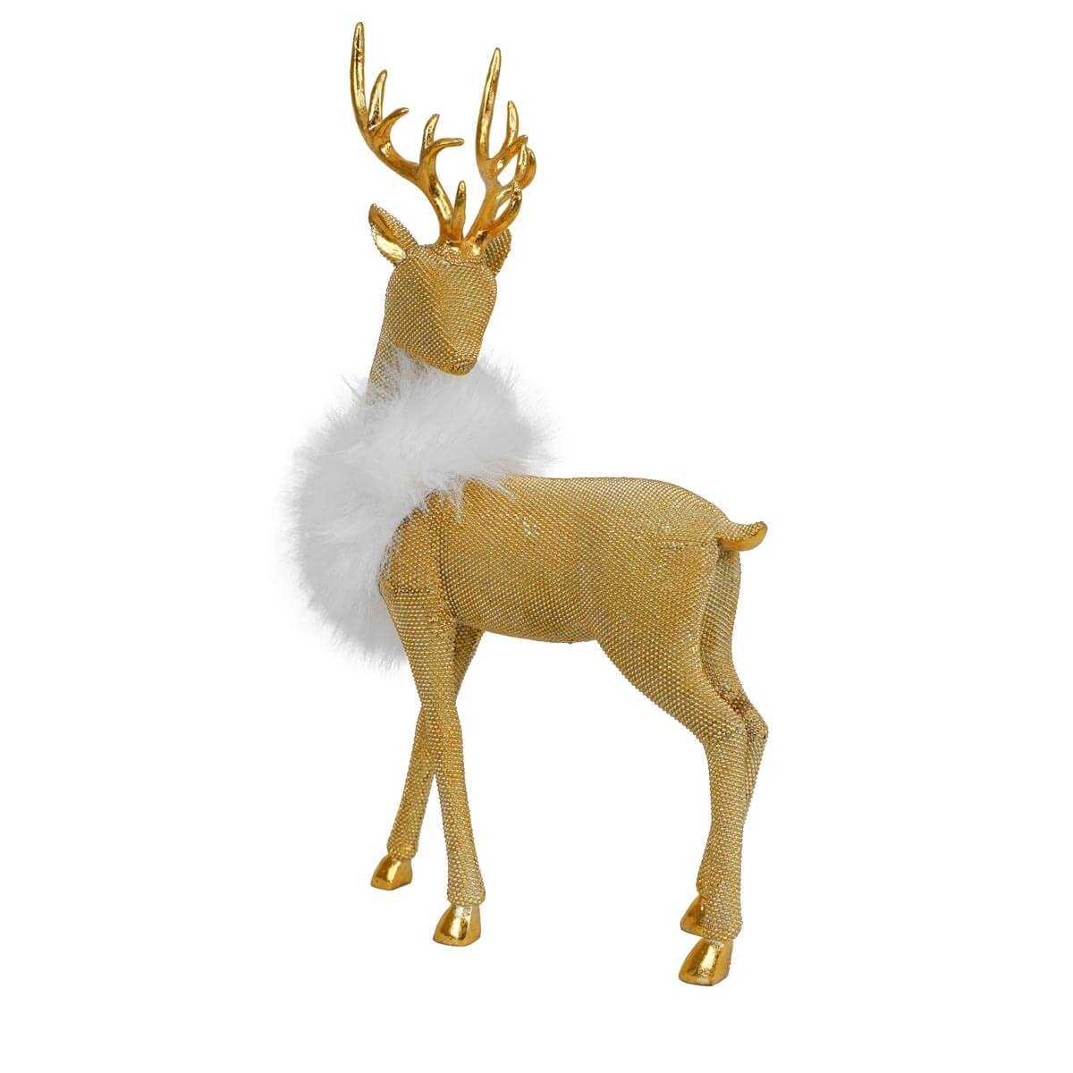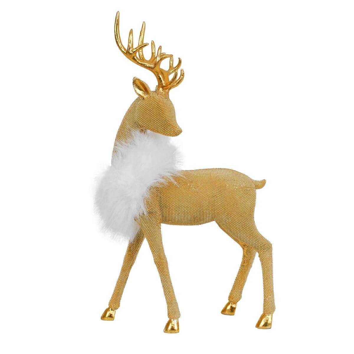 Renna Natalizia Decorativa in Resina Dorata con Collo in Peluche Bianco