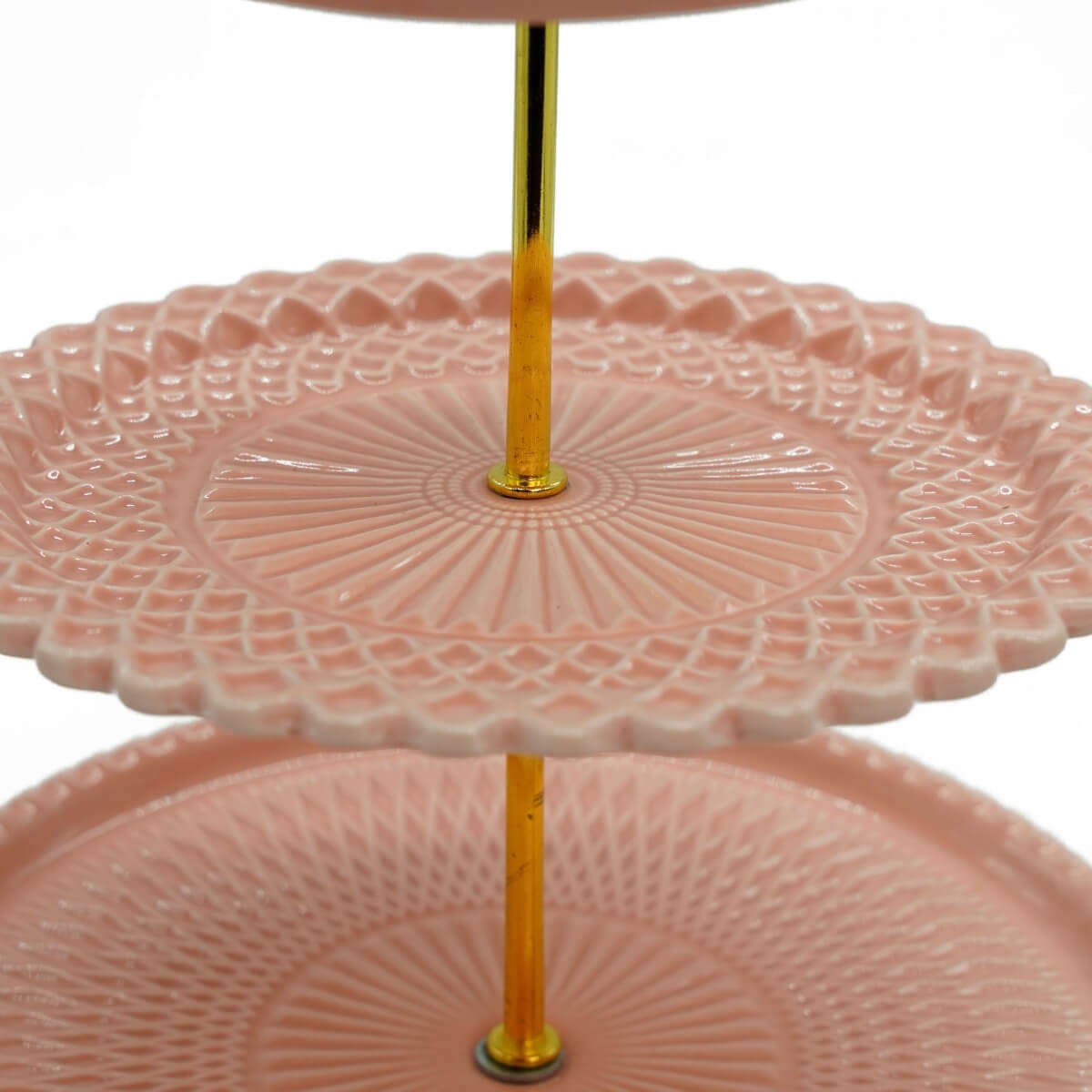Realizzata in resina resistente, è una scelta ideale sia per uso domestico che per eventi, allestimenti professionali, buffet natalizi e vetrine a tema. Ogni piano presenta raffinate lavorazioni decorative, mentre il supporto centrale dorato dona un accento prezioso e festivo.