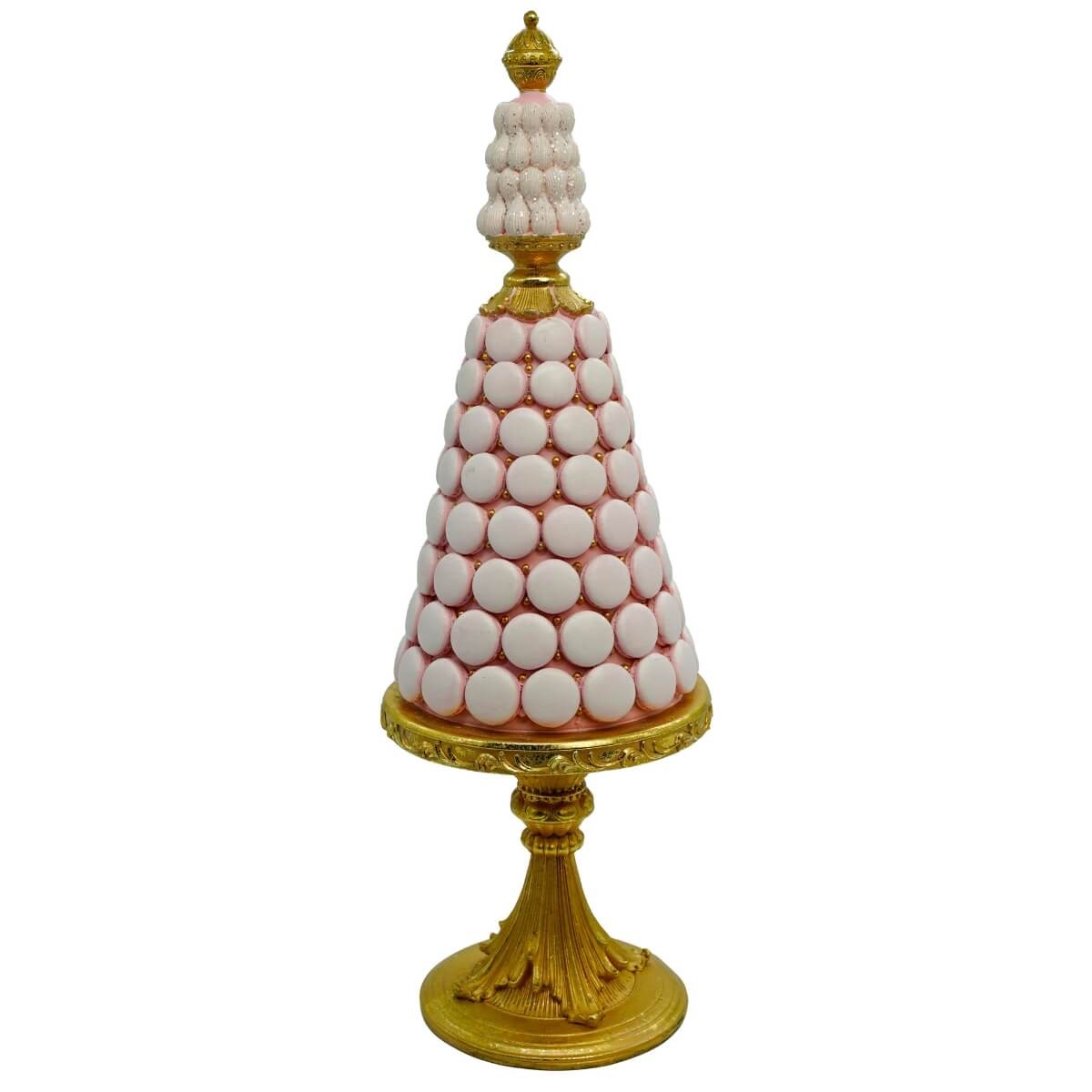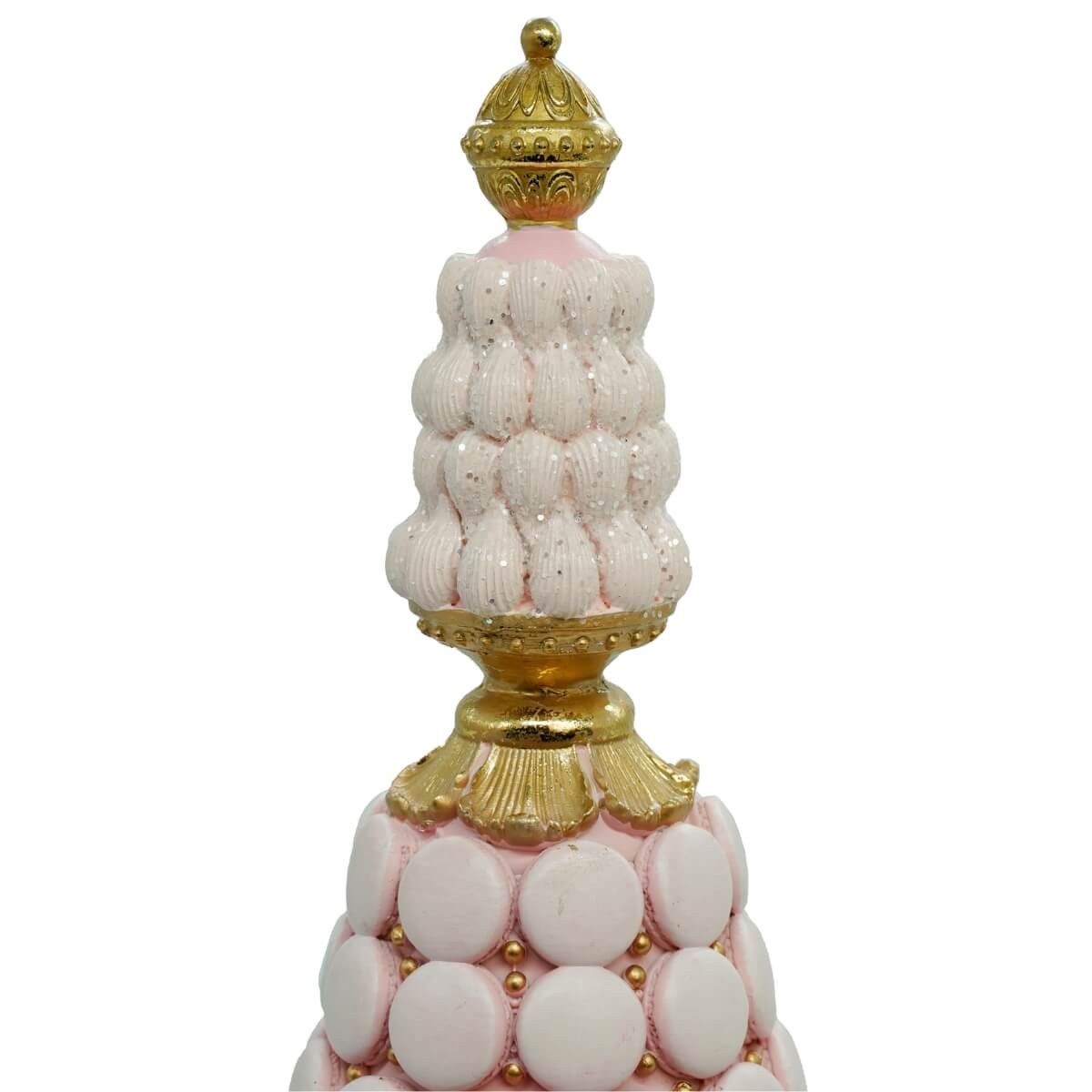 Realizzato in resina di alta qualità, è curato in ogni dettaglio: dai macarons rosa perfettamente disposti in forma conica, fino alla base dorata barocca che dona stabilità e un effetto lussuoso. Con la sua altezza di 54 cm, è ideale per essere posizionato su tavoli, consolle, vetrine o centrotavola, attirando lo sguardo con classe e stile.