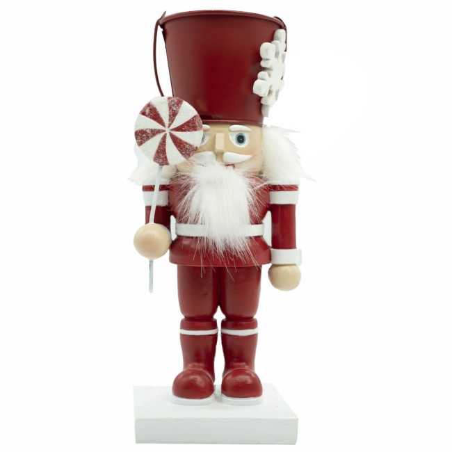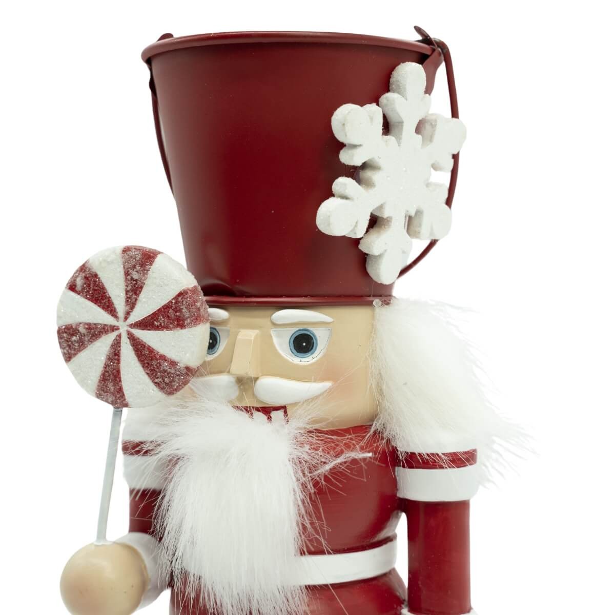 Porta un tocco originale e raffinato al tuo Natale con questo elegante schiaccianoci decorativo in resina, impreziosito da un cappello a forma di secchio in latta rossa con fiocco di neve. Dipinto nei classici colori bianco e rosso, è perfetto per arricchire vetrine, camini, scaffali o allestimenti tematici natalizi. Con la sua espressione buffa e il bastoncino di zucchero glitterato, dona un tocco giocoso e tradizionale a qualsiasi ambiente. Realizzato con materiali di qualità e finiture curate nei dettagli, è ideale anche come idea regalo per chi ama le decorazioni originali e senza tempo.