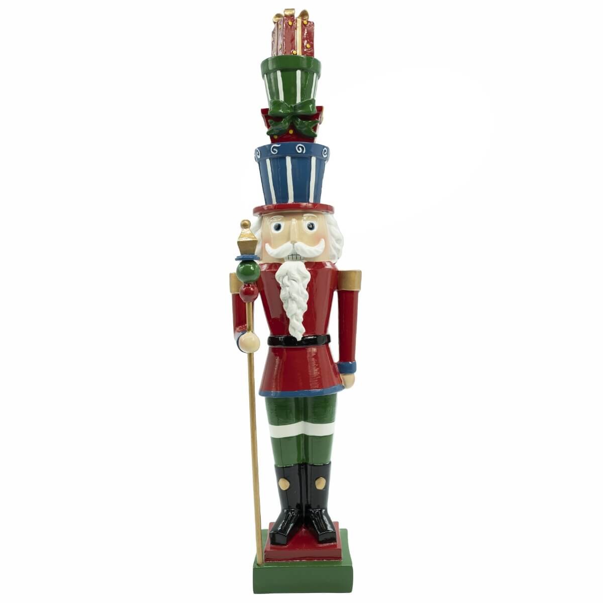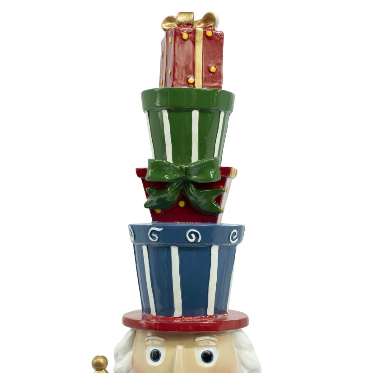 Porta un tocco fiabesco alle tue decorazioni con questo elegante schiaccianoci natalizio in resina, alto 51 cm, perfetto per arricchire vetrine, ingressi o angoli tematici. Il design raffinato e originale si distingue per il cappello composto da pacchi regalo impilati, un dettaglio unico che cattura subito l’attenzione. Realizzato in resina resistente, con base stabile da 12 x 10 cm, unisce estetica e funzionalità, diventando protagonista delle decorazioni natalizie per negozi, showroom e ambienti domestici. Ideale per allestimenti scenografici, questo schiaccianoci è l’elemento decorativo perfetto per trasmettere la magia del Natale.