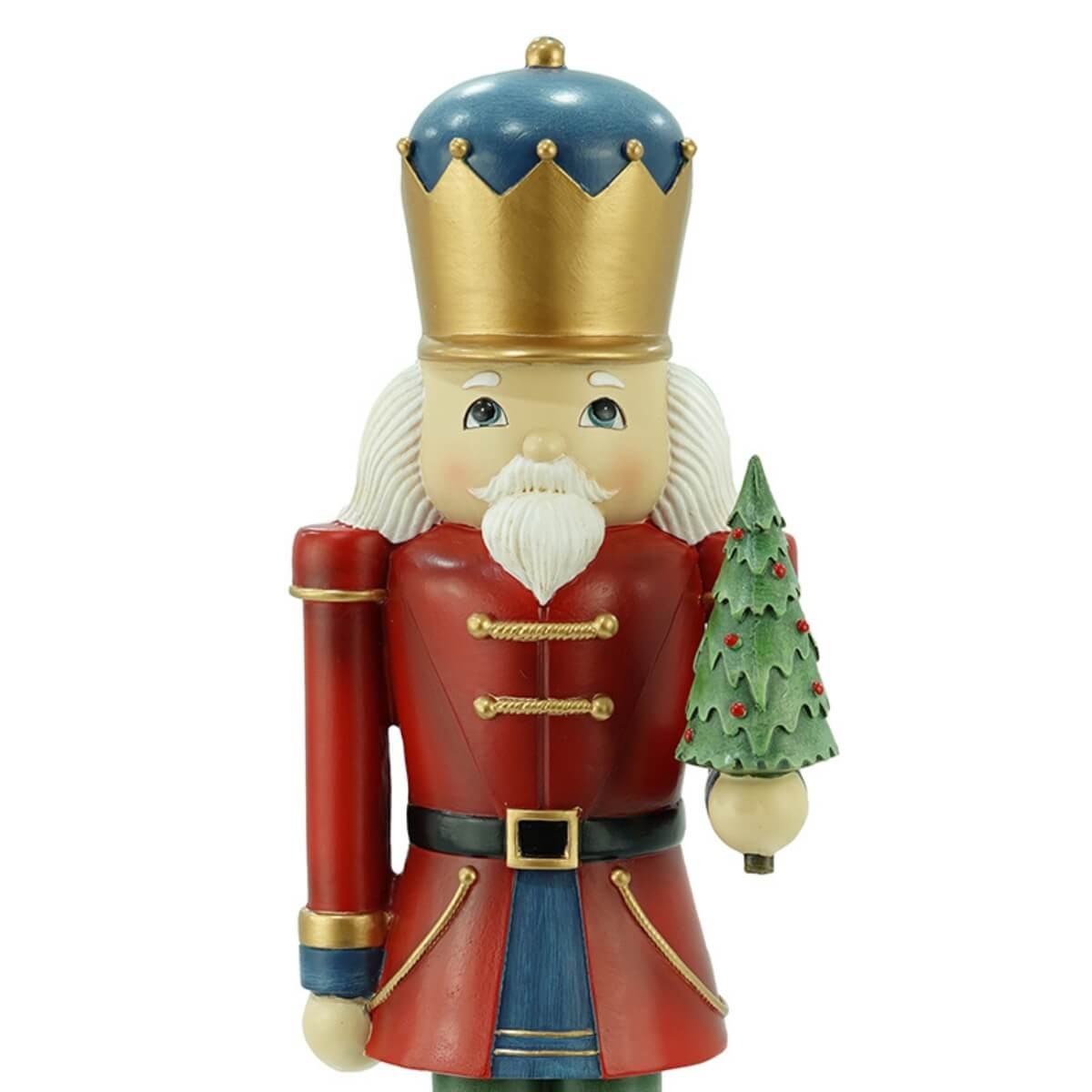 Schiaccianoci Natalizio in Resina H.38,3 cm – Soldatino con Giacca Rossa e Albero, Corona Blu e Oro