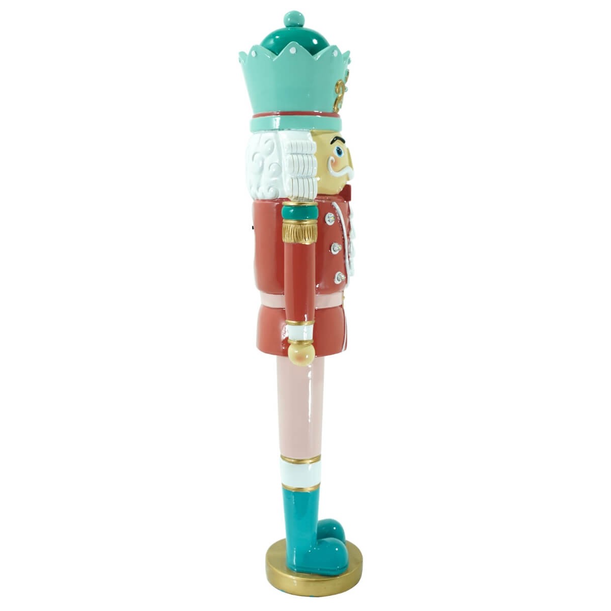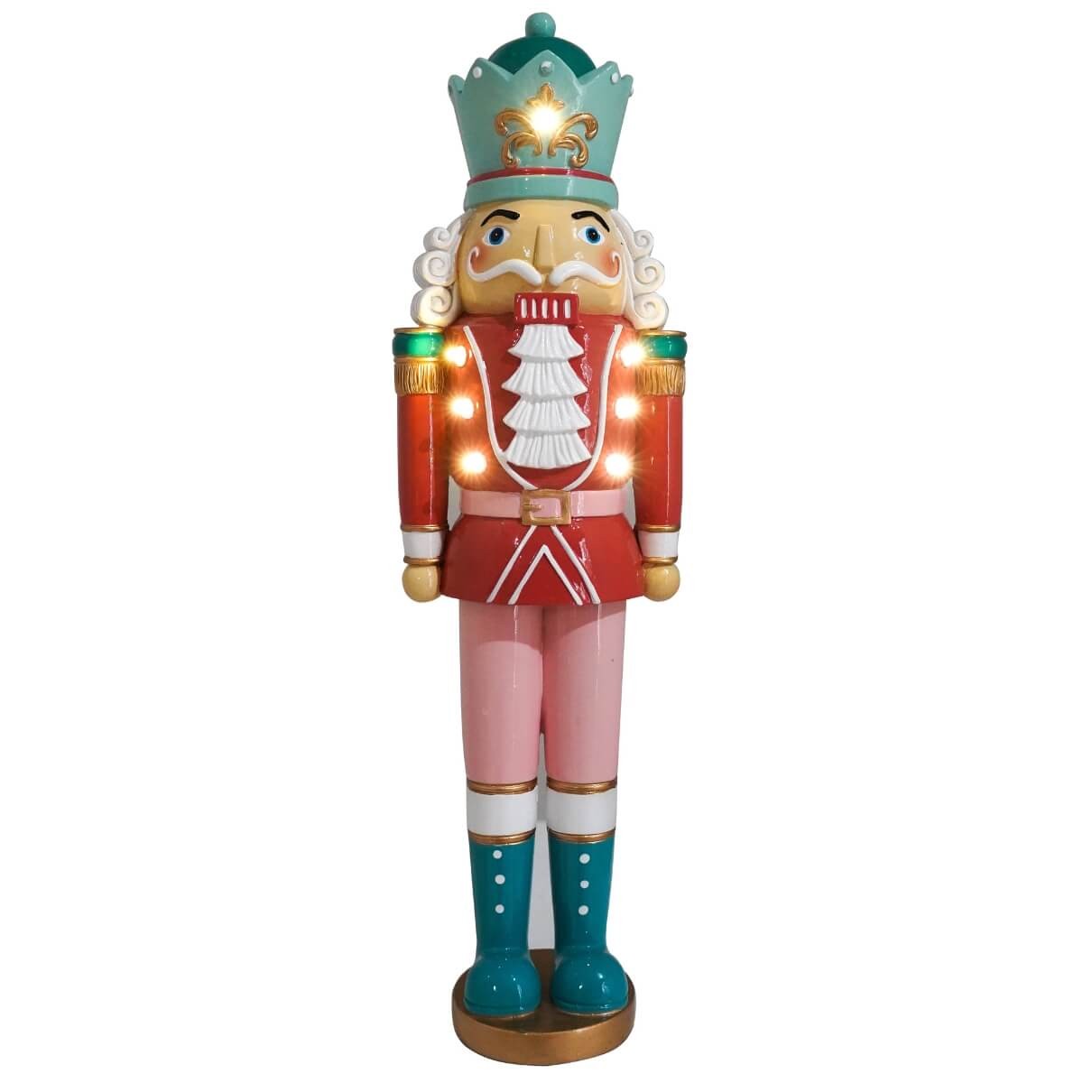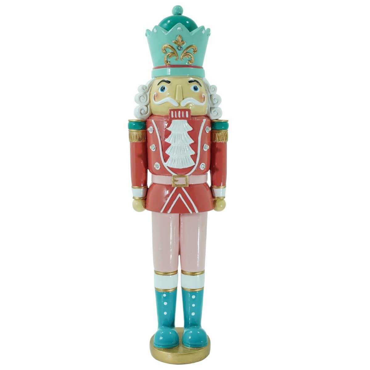 Rendi magico ogni angolo della casa con lo schiaccianoci decorativo rosa e azzurro con luci LED, un connubio perfetto tra tradizione natalizia e stile contemporaneo. Alto 47 cm, questo elegante soldatino in poliresina sfoggia una raffinata divisa nei toni pastello, arricchita da dettagli oro e uno scenografico cappello a corona azzurra decorata con fregi dorati.