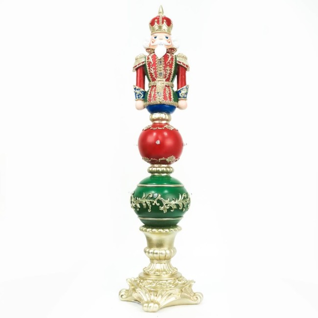 Accendi la magia delle feste con lo Schiaccianoci Natalizio con luci LED, un’elegante decorazione alta 61 cm che unisce tradizione e luminosità. Realizzato con dettagli preziosi e rifinito nei classici colori natalizi – rosso, verde, blu e oro – questo schiaccianoci è perfetto per impreziosire l’ingresso, il soggiorno o una vetrina festiva. Le sfere su cui è posizionato sono ornate con motivi dorati e illuminate da piccoli LED che creano un'atmosfera calda e accogliente. La base dorata lavorata dona stabilità e un tocco regale all’intera composizione.