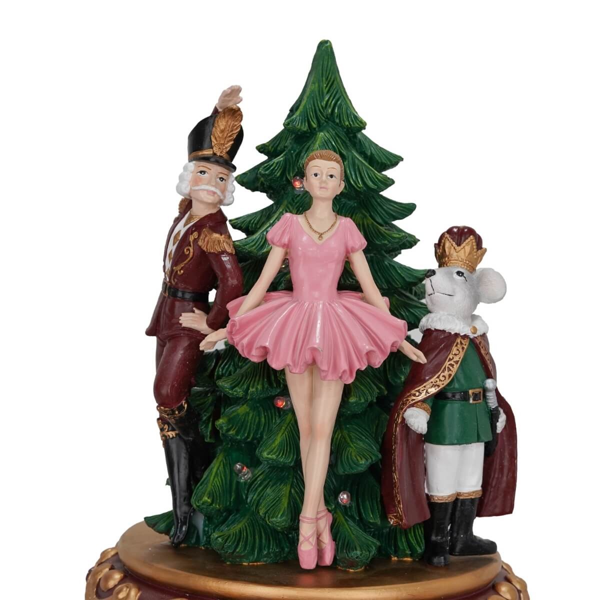Porta nel tuo Natale l’eleganza delle fiabe classiche con questo raffinato schiaccianoci natalizio da 95 cm, realizzato in resina e dotato di illuminazione LED e movimento. Il suo design esclusivo combina elementi decorativi sofisticati con una scena scenografica in cima, raffigurante ballerine e personaggi del celebre balletto “Lo Schiaccianoci”, sotto un grande albero.
