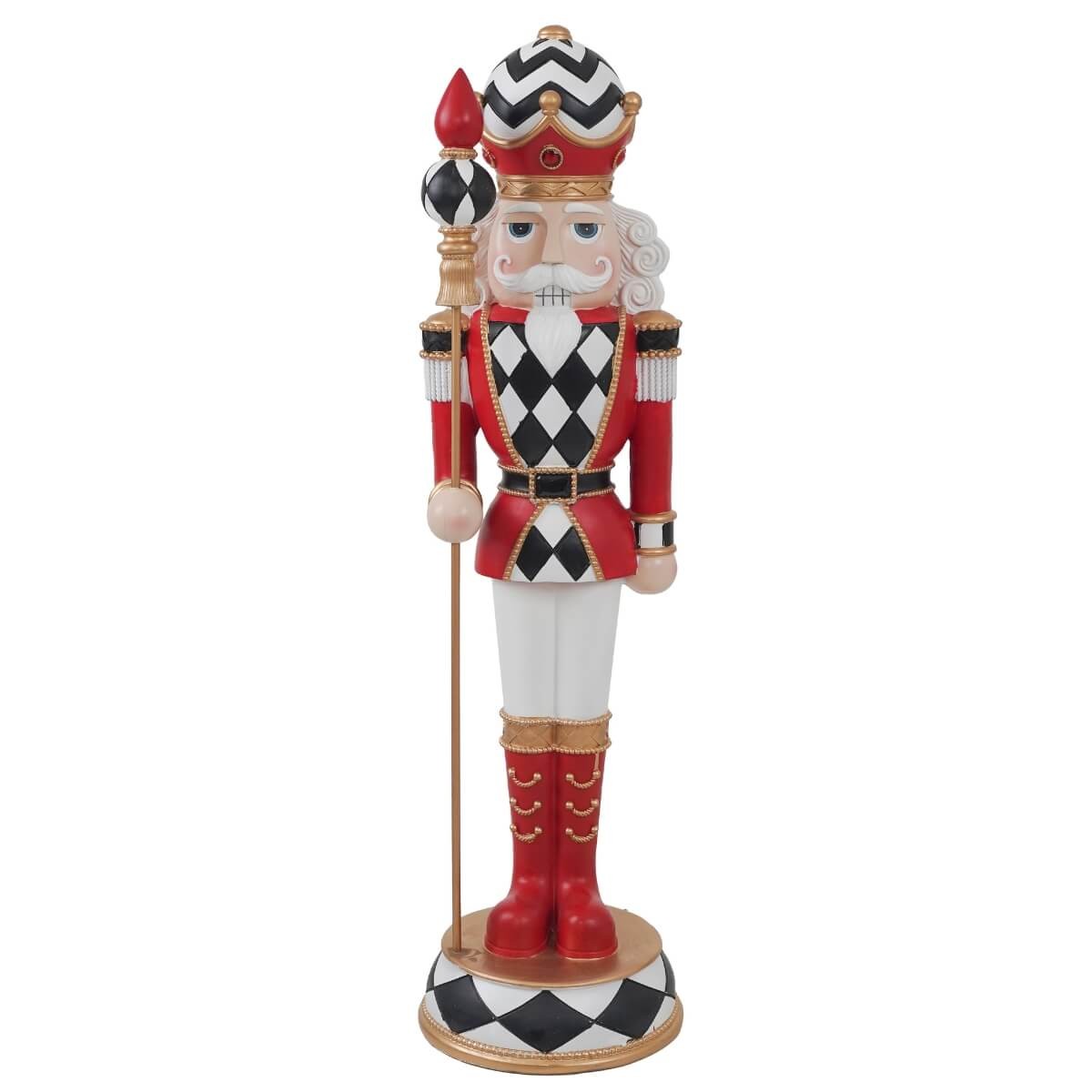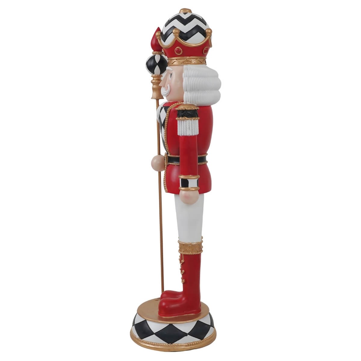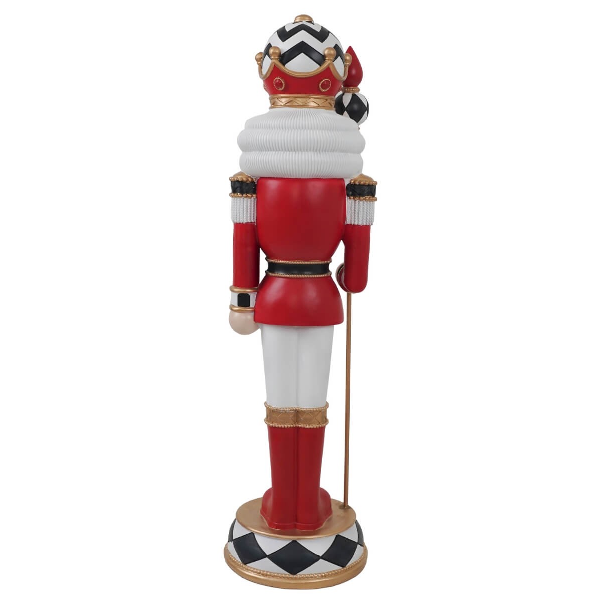 Realizzato in resina di alta qualità, lo schiaccianoci si distingue per la combinazione di colori vivaci (rosso, nero, bianco e oro) e per le sue finiture curate, dalla corona dorata al bastone cerimoniale. La sua imponenza lo rende ideale come decorazione d’ingresso, per vetrine natalizie, showroom, hotel, ristoranti o grandi ambienti domestici.