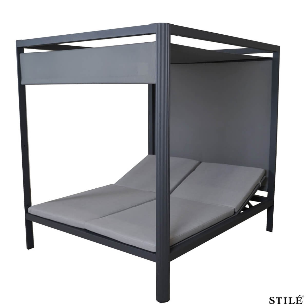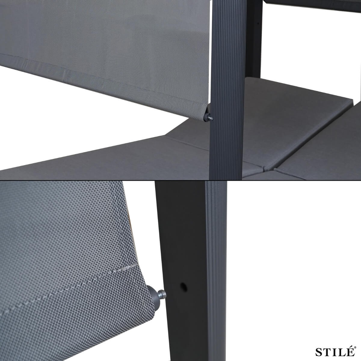 La struttura in alluminio resistente e leggero garantisce stabilità e durata nel tempo, anche in condizioni esterne. Il baldacchino con telo in Textilene offre protezione dal sole mantenendo una ventilazione ottimale, ideale per le giornate più calde.