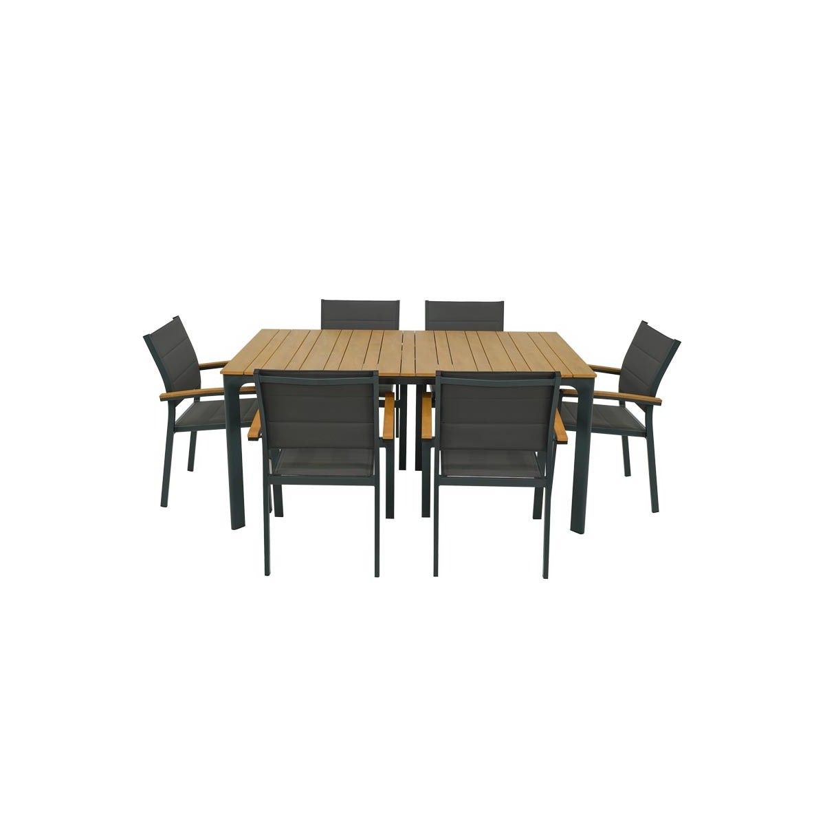 Il tavolo Osiride si contraddistingue per la sua linea elegante e per il design moderno, perfetto per arredare il vostro giardino o la terrazza. Questo set comprende un tavolo e sei sedute; realizzato con una solida struttura in alluminio e piano in polywood, mentre la seduta e lo schienale delle sedie sono in textilene. Cosa c'è di meglio che trascorrere le belle giornate estive all'aperto con amici e familiari? Ora grazie a questo set completo potrete ospitarli comodamente.
