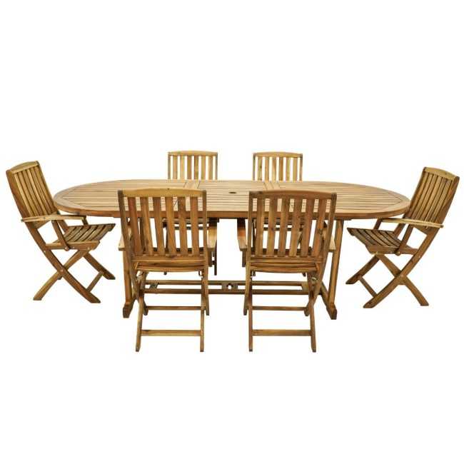 l tavolo ovale allungabile, realizzato in legno di acacia di alta qualità, offre la massima flessibilità per le tue esigenze. Con dimensioni di 180x100x75 cm che può essere esteso fino a 240 cm, questo tavolo si adatta facilmente alle tue esigenze di spazio. Le sedie pieghevoli, coordinate al tavolo, offrono comfort e praticità. Con le loro dimensioni di 56x53.5x96 cm (L x P x H), garantiscono un sostegno ottimale e possono essere facilmente riposte quando non in uso, ideali per ottimizzare lo spazio nel tuo giardino o terrazzo.