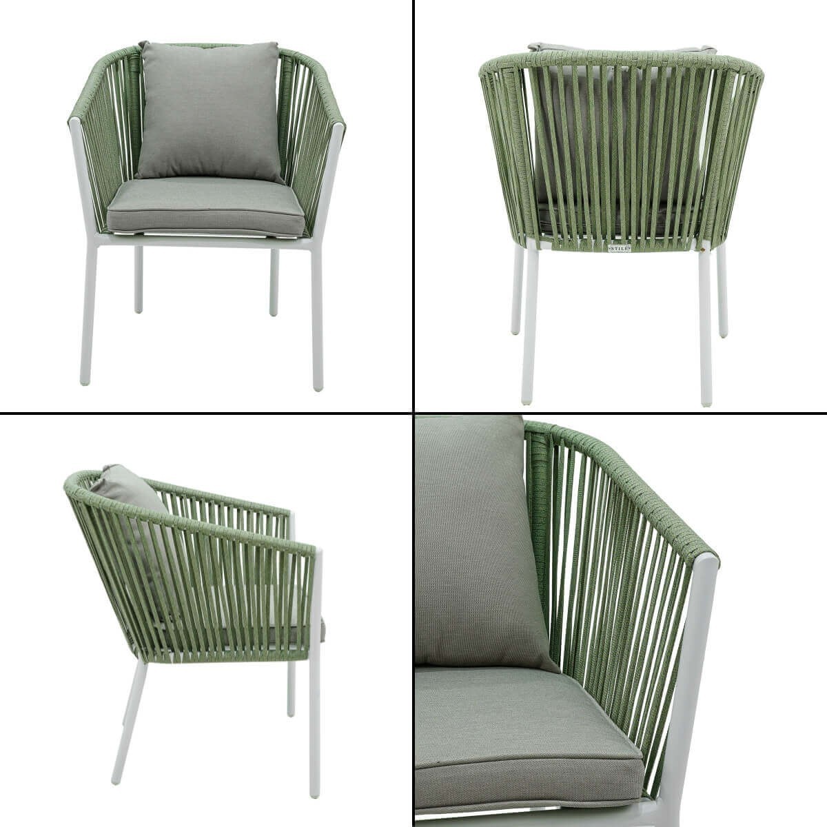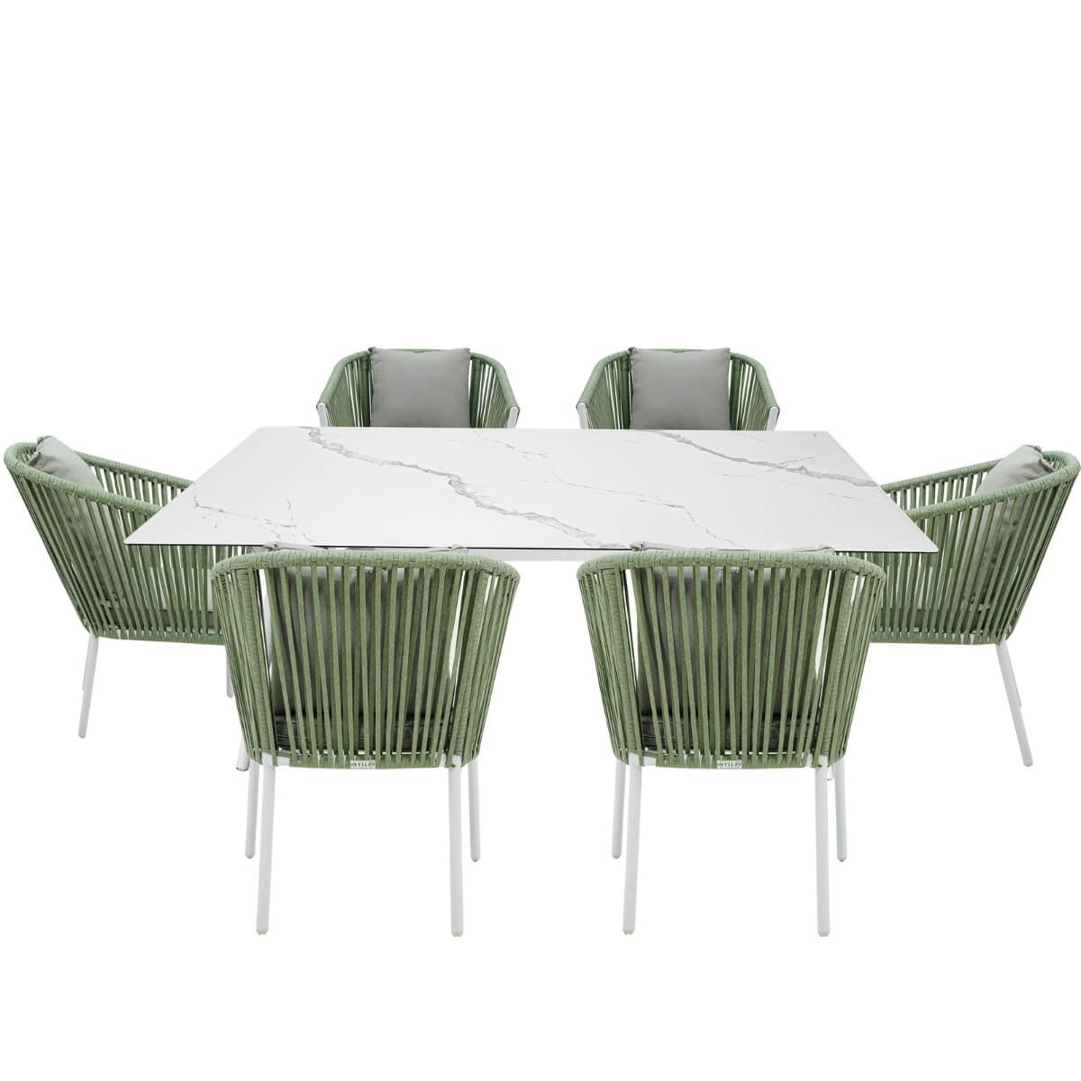 Il tavolo, con una struttura in alluminio resistente e un piano in vetro temperato effetto marmo, aggiunge un tocco di lusso al tuo ambiente esterno. Le sedie coordinate, realizzate con una combinazione di alluminio e corde intrecciate, offrono un comfort ergonomico e un design accattivante.