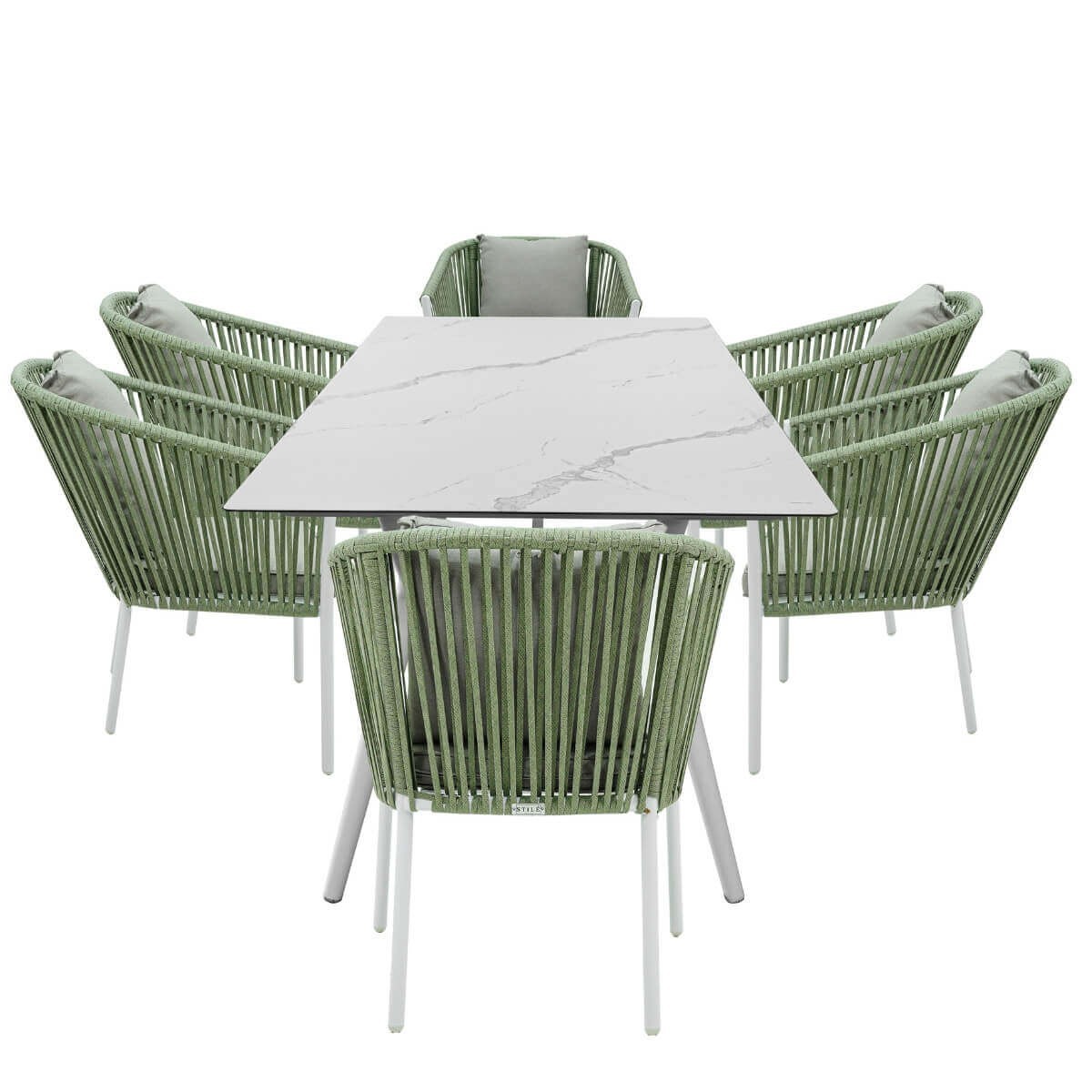 Eleganza e Comfort: Set Tavolo in Allumino da Giardino New Castle con piano in Vetro temperato Effetto Marmo e Sedie in Alluminio e corda