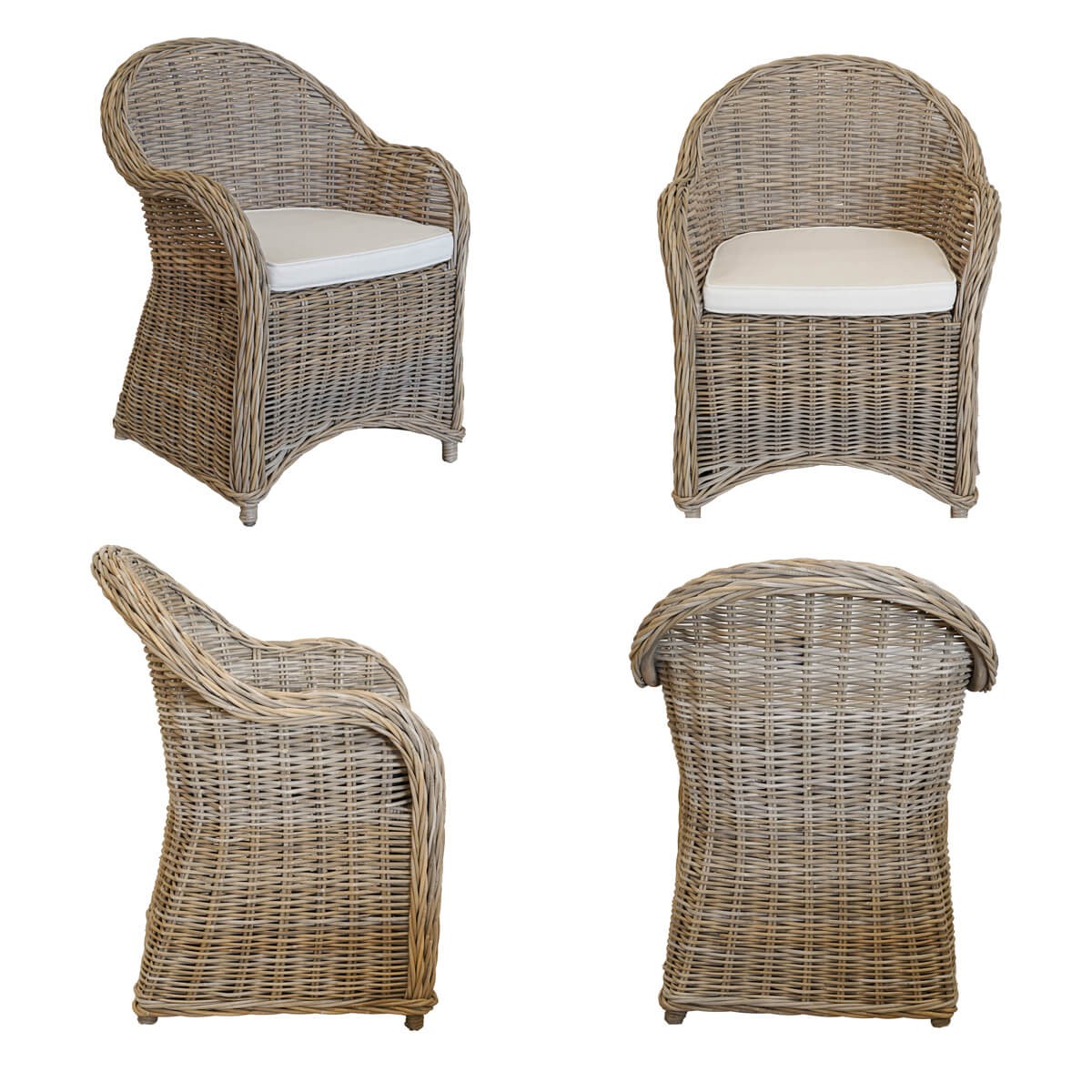 Le sei poltroncine abbinate, in rattan intrecciato, offrono una seduta ampia (65x67xH.85 cm) e confortevole. Ogni sedia è dotata di un cuscino sfoderabile in tessuto Olifen, tipo di tessuto realizzato in polipropilene, un materiale tecnico pensato per l’outdoor, resistente a raggi UV, umidità e scolorimento. Disponibili nei colori bianco o nero, per adattarsi al tuo gusto e facilitare la manutenzione.